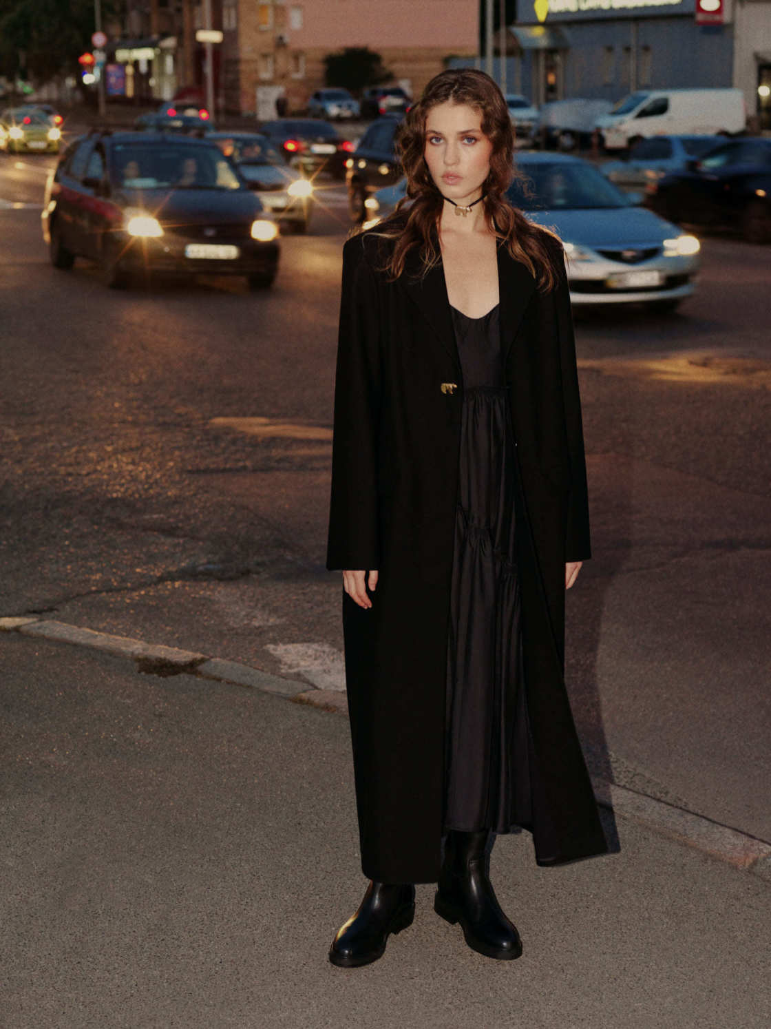 В этом сезоне бренд предлагает черное пальто ассиметричного кроя, выполненное из шерсти и кашемира. Модель со спущенной линией плеч и поднятым воротником отлично завершит как повседневный, так и вечерний образ. Сочетайте пальто с сапогами с острым носком и ботинками на платформе.