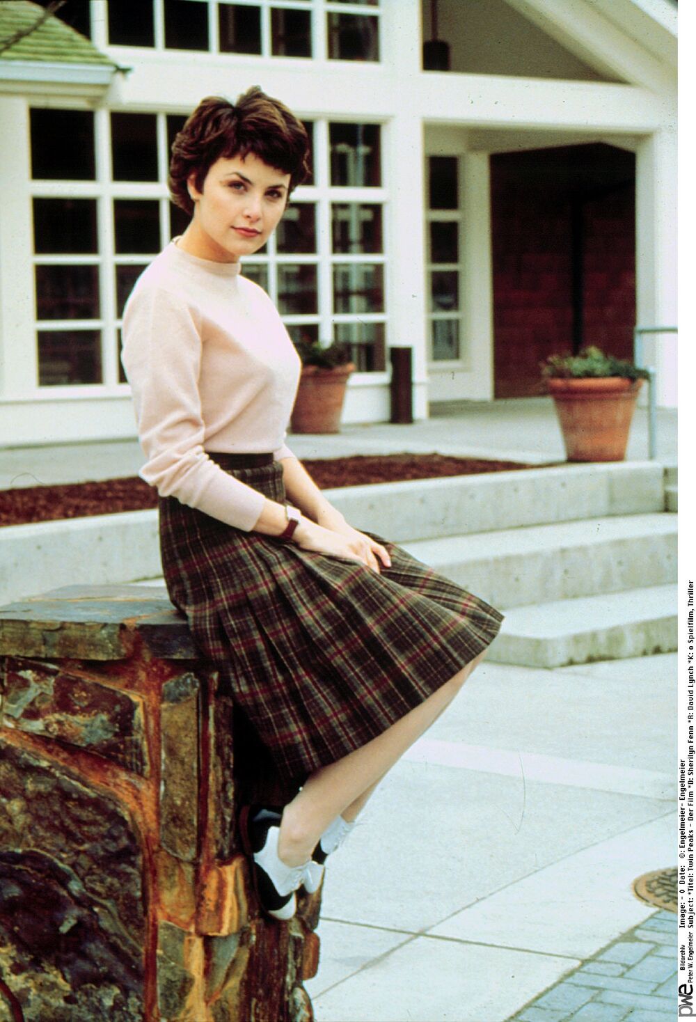 Школьницу Одри Хорн в легендарном сериале Дэвида Линча «Твин Пикс» сыграла 25-летняя Шерилин Фенн. Стилисты умело поработали с раскрепощенным, но при этом целомудренным образом актрисы, подобрав для нее в качестве формы fitted sweater (короткий приталенный свитер) и юбку в стиле preppy. Из аксессуаров – красная помада и кожаные туфли-лодочки на каблуках. Плетеный трикотажный свитер с круглым воротником и короткими рукавами-баллонами мы нашли в Zara, а юбку с узором тартан из твида у Thom Browne.