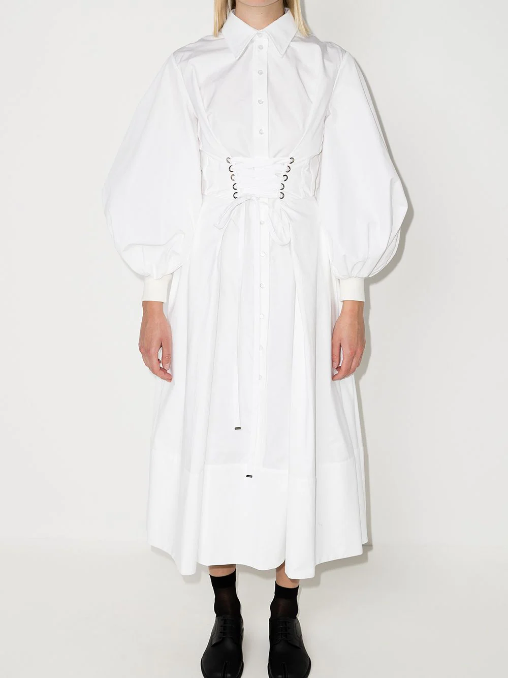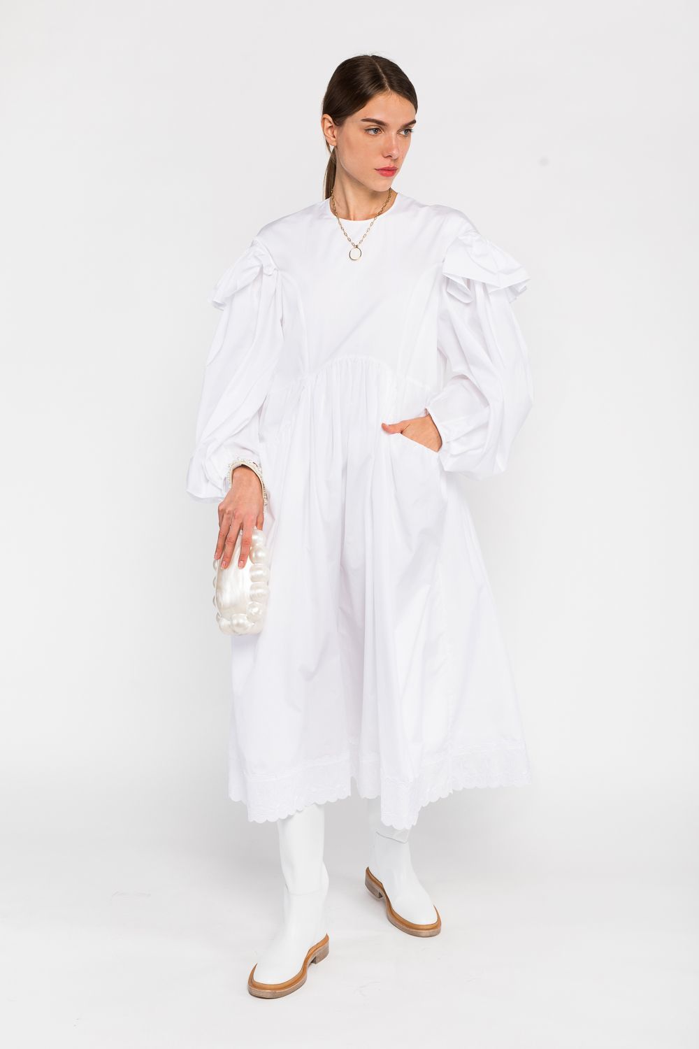 Чтобы повторить романтические и элегантные образы воспитанниц закрытой девичьей школы Эппл-ярд из книги и одноименного фильма «Пикника у Висячей скалы», достаточно отыскать закрытое белое платье из муслина или хлопка, декорированное кружевом и всевозможными застежками и завязками. Дополнить его полевыми цветами, бриллиантовой брошью, шелковой лентой на пояс или соломенной шляпой. Подходящие наряды мы нашли у Simone Rocha и Alexander McQueen. Объемное платье с длинным рукавом и сборками на плечах и платье-рубашка со вставкой-корсетом.