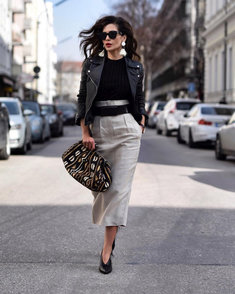 Чтобы не выглядеть в кожаной вещи вульгарно, верх к ней должен быть закрытым. Так, гармоничный ансамбль можно составить с однотонной рубашкой или блузкой, объемным джемпером. Если ее заменить топом, то к нему обязательно следует надеть кардиган или жакет. Завершенным сделает образ обувь на устойчивом и не слишком высоком каблуке: лодочки, босоножки без лишних деталей, лоферы, ботильоны, высокие сапоги.