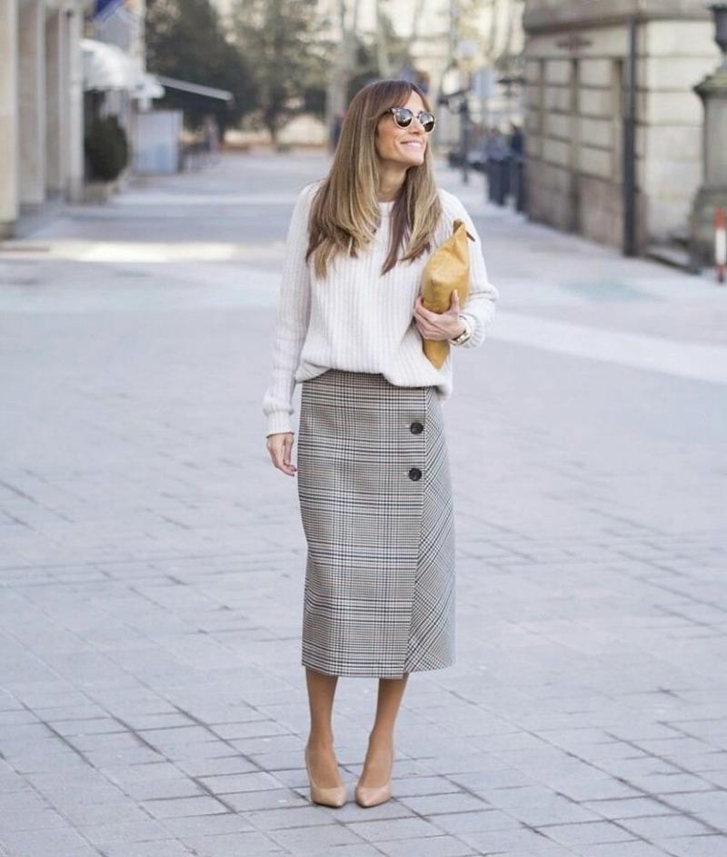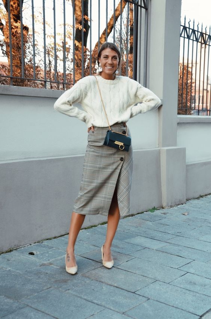 Для создания стильных аутфитов с модными юбками на холодное время года подойдут водолазки, джемпера с V-образным вырезом горловины, пуловеры, кардиганы, свитера крупной вязки, рубашки и блузки. Здесь важно найти баланс между верхом и низом. Если юбка яркой расцветки или сложного кроя, то рубашку или пуловер к ней должны быть более спокойными, и, наоборот – к простым классическим моделям можно подобрать более интересный верх.