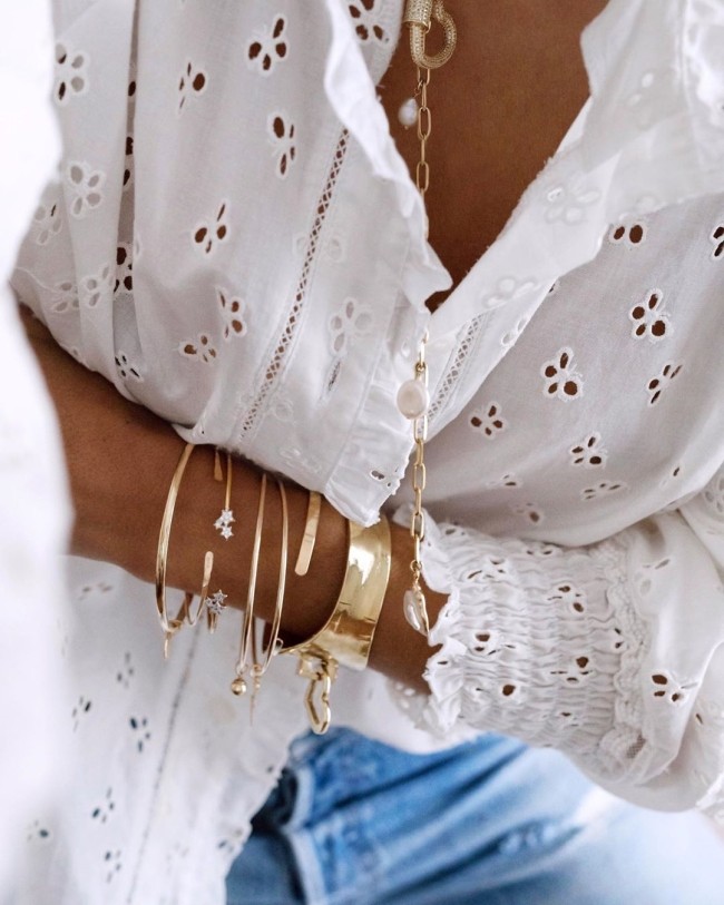 - множество украшений (несколько браслетов, цепочек). В сезоне весна-лето 2021 девиз такой: украшений много не бывает!