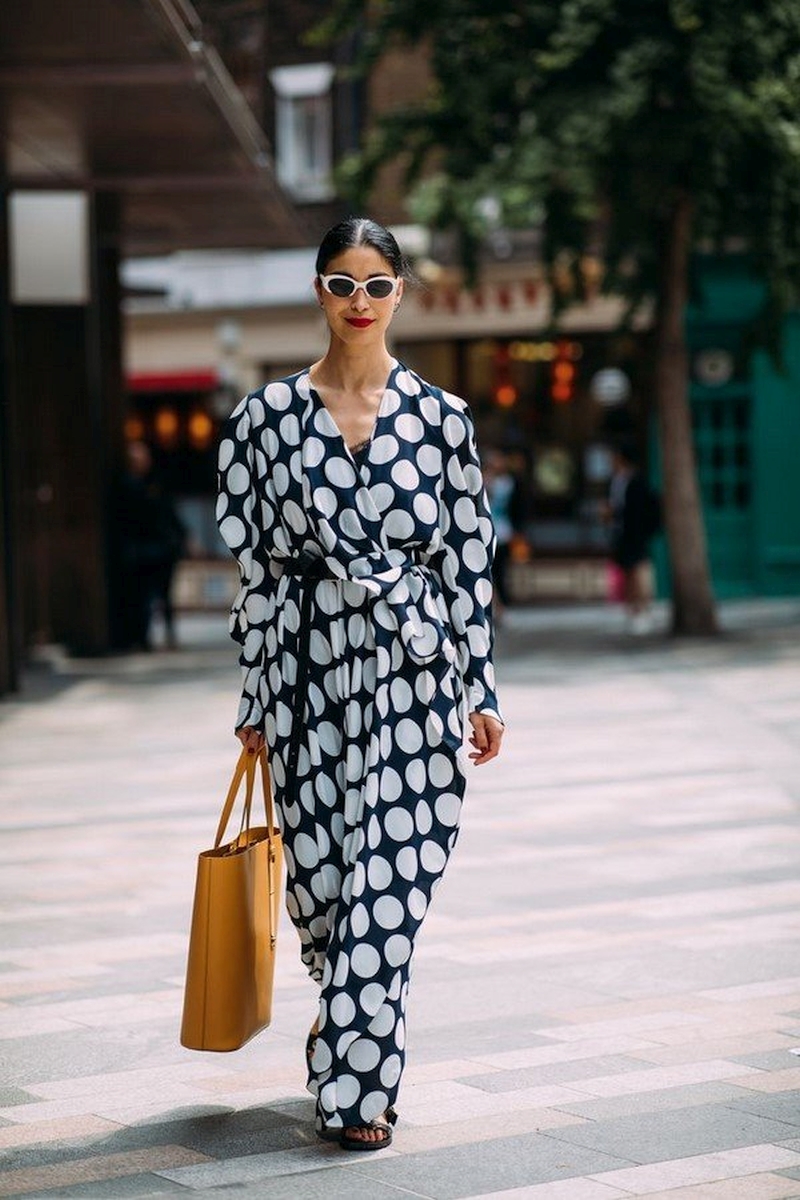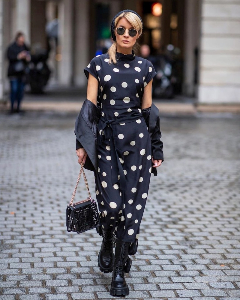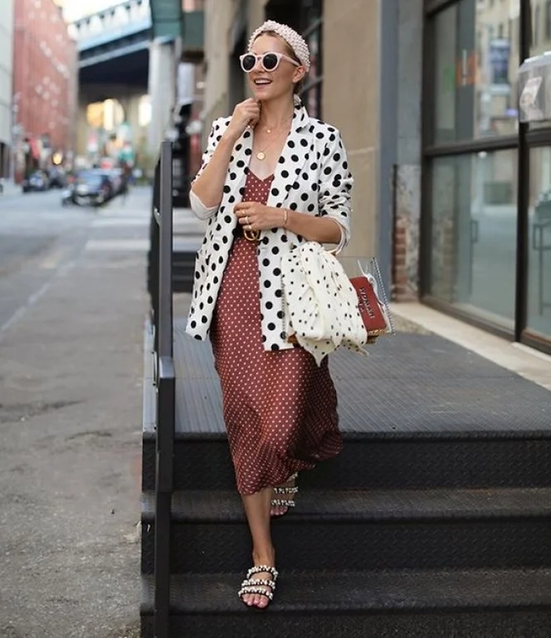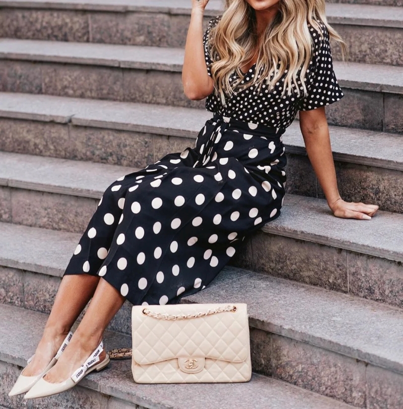 - polka dots достаточно активный принт, поэтому дополнять его лучше однотонными аксессуарами, при этом они не обязательно должны повторять цвет горошин или ткани.