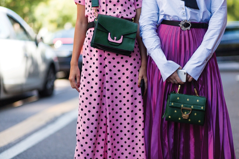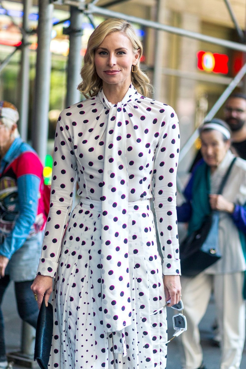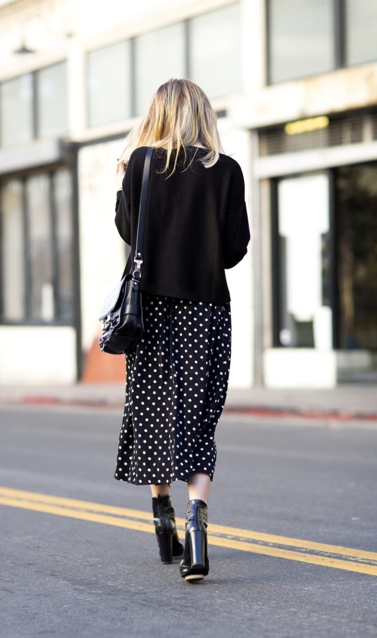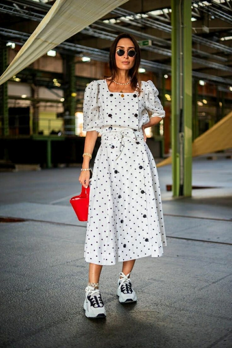 - polka dots достаточно активный принт, поэтому дополнять его лучше однотонными аксессуарами, при этом они не обязательно должны повторять цвет горошин или ткани.