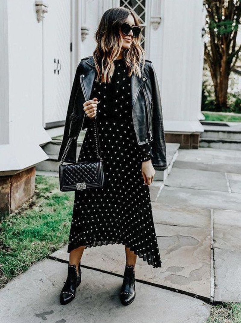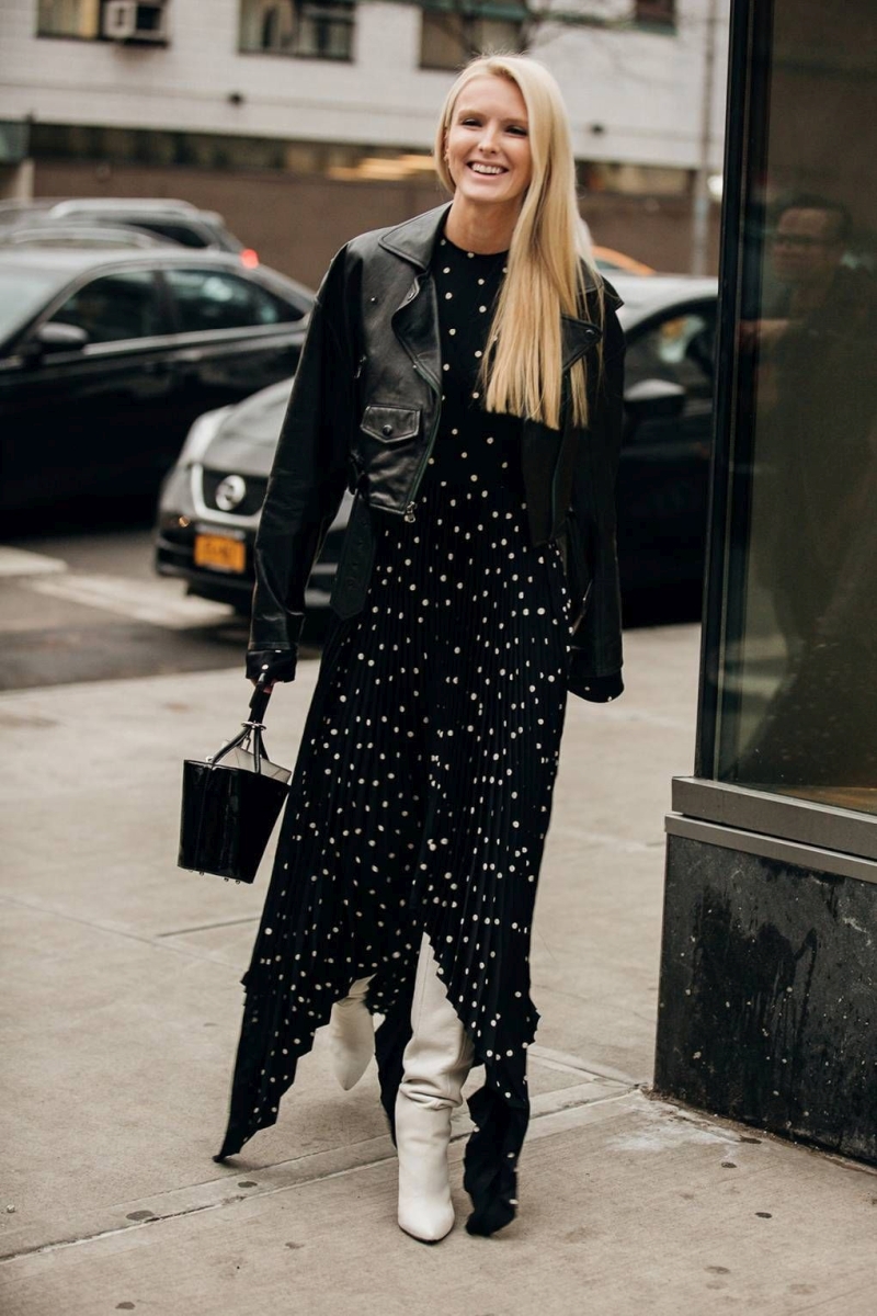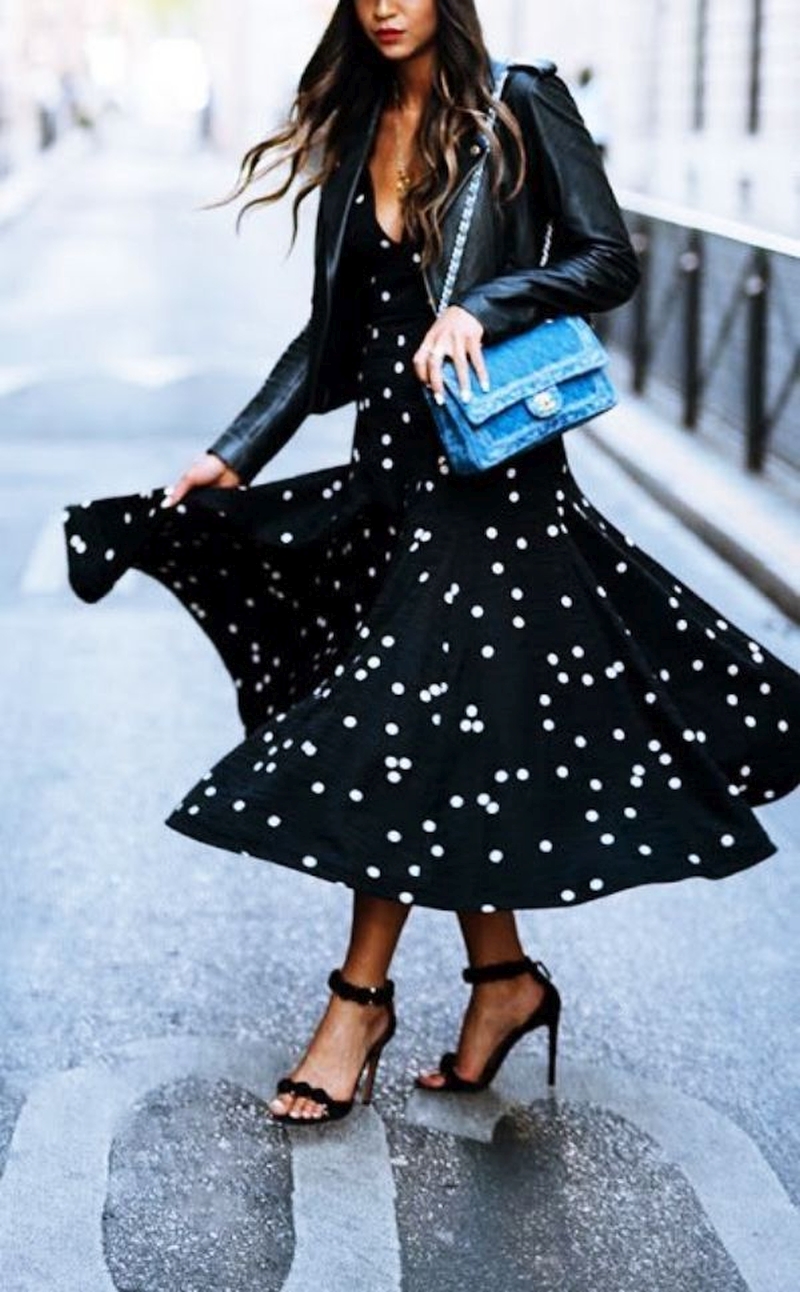 Молодые барышни могут позволить себе сочетать невесомые шифоновые вещи в горох с обувью на плоском ходу (балетками, мокасинами или кроссовками) и джинсовой курткой или кожаной косухой.