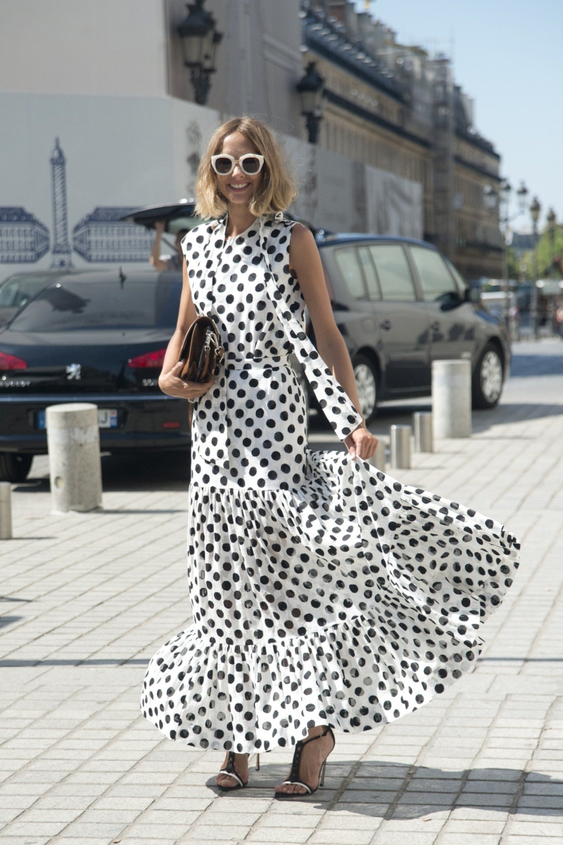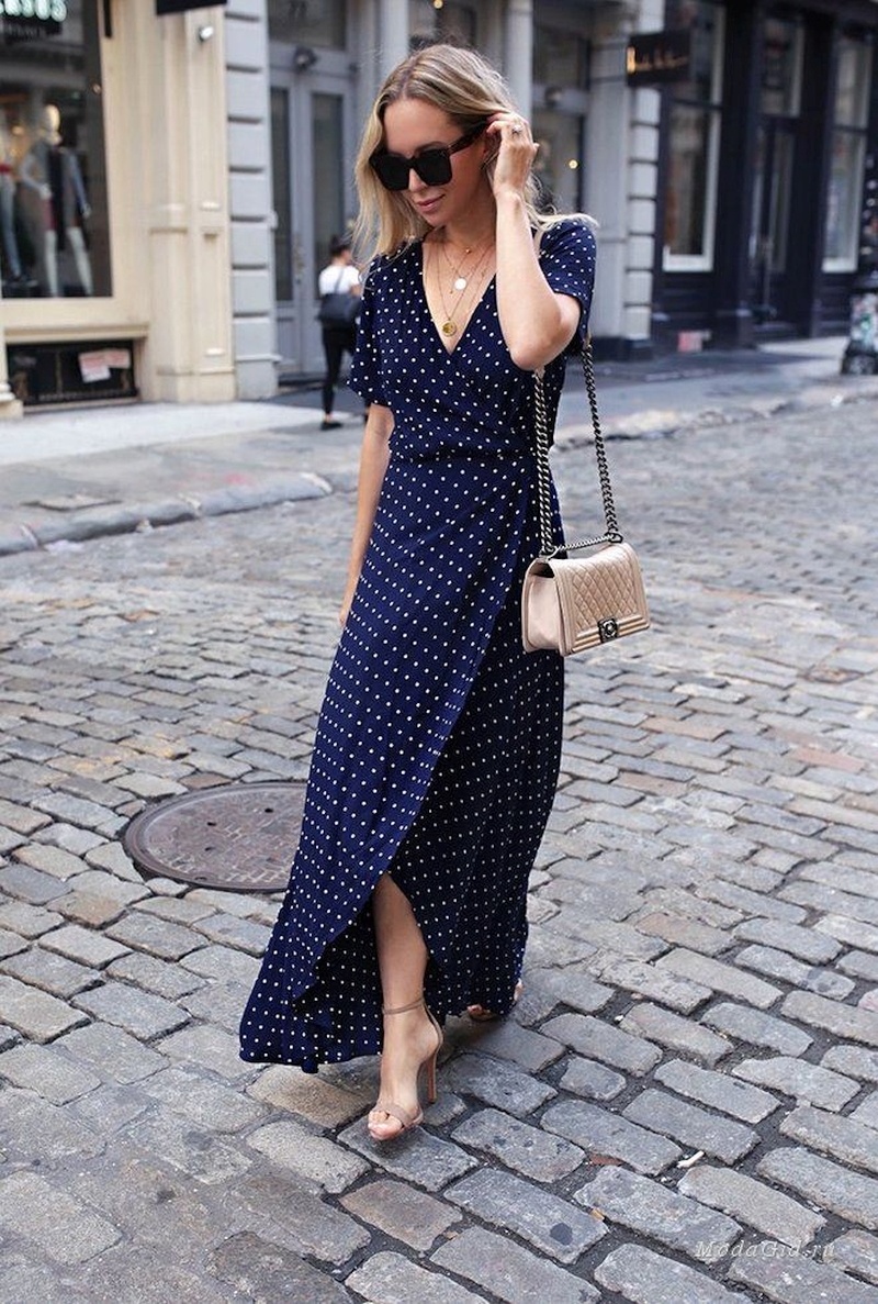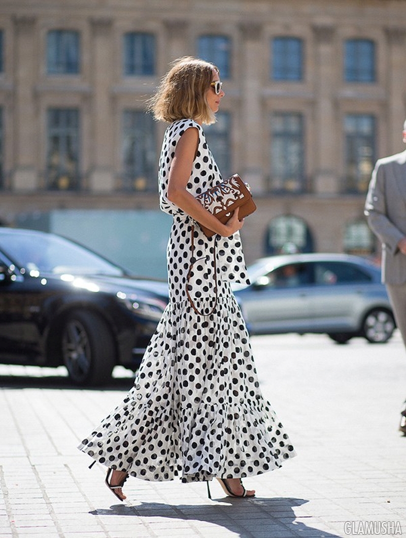 Длинное платье в пол – абсолютный must have летнего гардероба. Такой наряд может быть как повседневным, так и для особых случаев. Поскольку среди стилистов нет единого мнения на тот счет, кому идут такой фасон, а мода благосклонна к всевозможным экспериментам, то такой аутфит в горошек могут себе позволить женщины разного роста и комплекции. Важно лишь выбрать свою модель и принт. При этом главная ставка должна быть на легкий непринужденный крой.