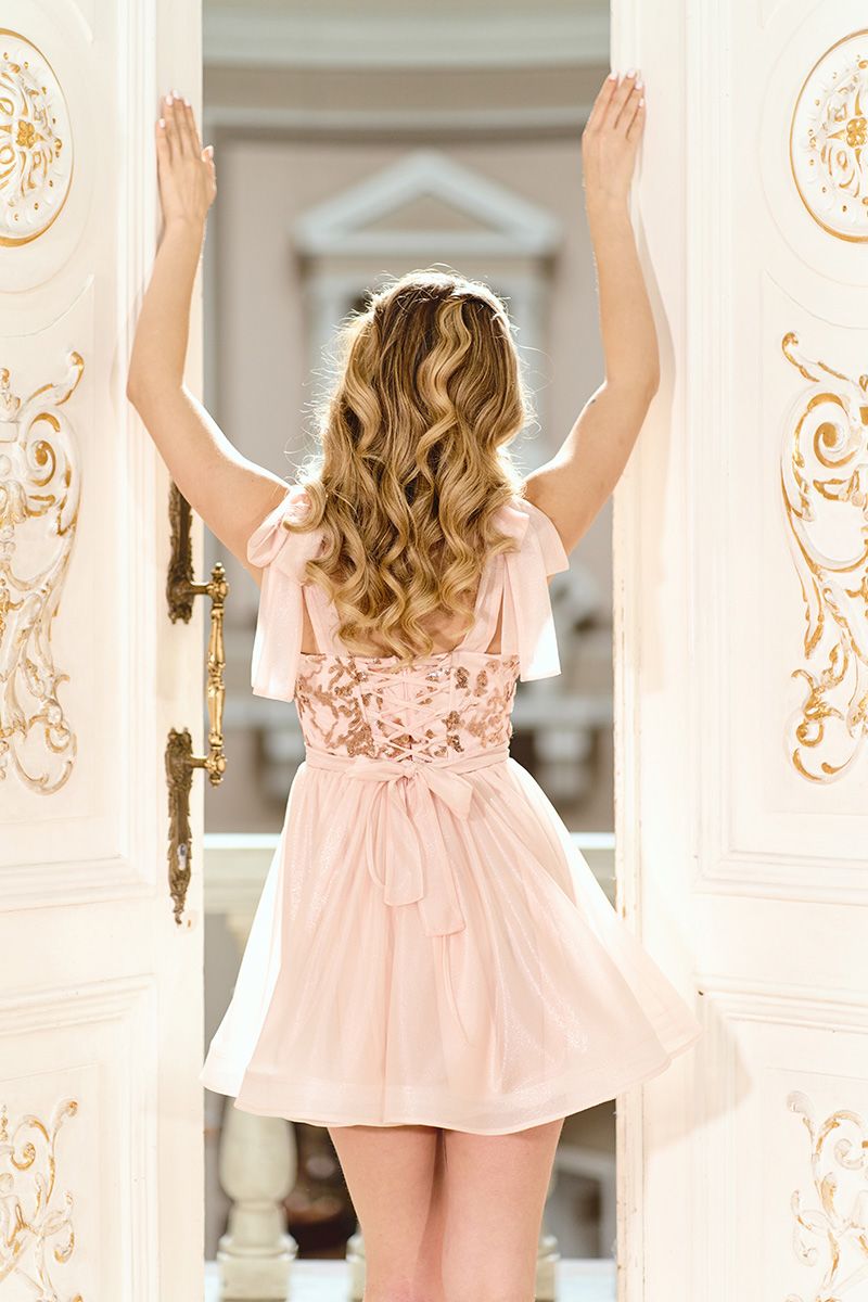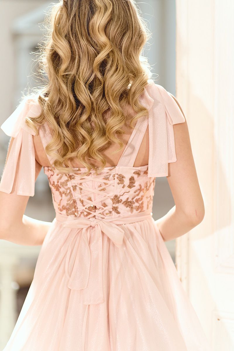 Потайна блискавка разом із корсетною шнурівкою по спинці дозволяють точно підлаштувати сукню під фігуру. Це забезпечує комфорт, надійну фіксацію та естетичний вигляд зі спини.