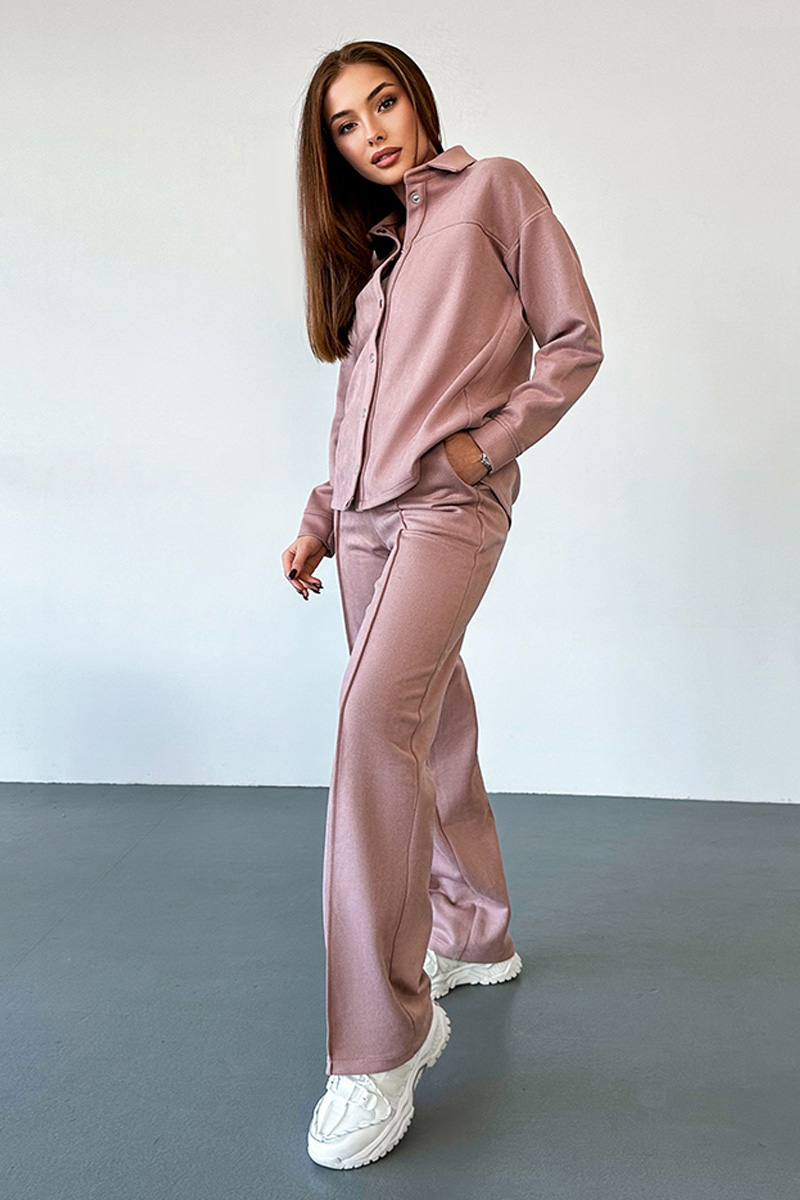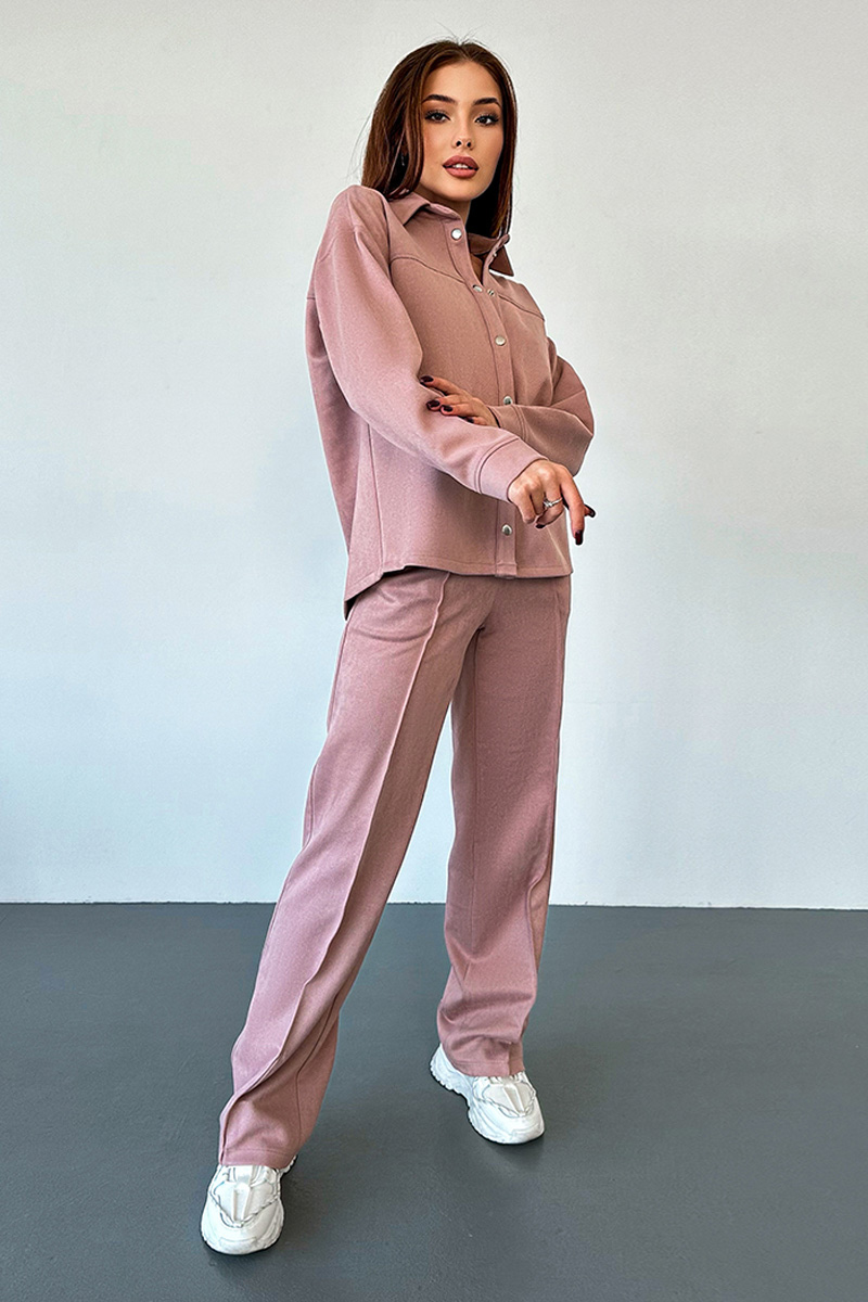 Брюки з поясом на резинці гарантують зручність носіння та ідеальну посадку. Декоративні стрілки надають штанам додаткової елегантності, а функціональні кармани роблять костюм практичним для щоденного використання. Рожевий Брючний замшевий костюм кнопки 23080 стане чудовим доповненням гардеробу сучасної жінки, яка цінує комфорт та стиль у кожному деталі.