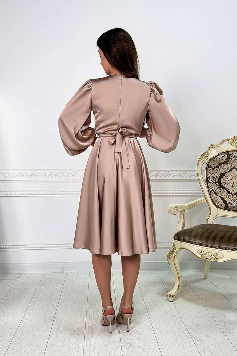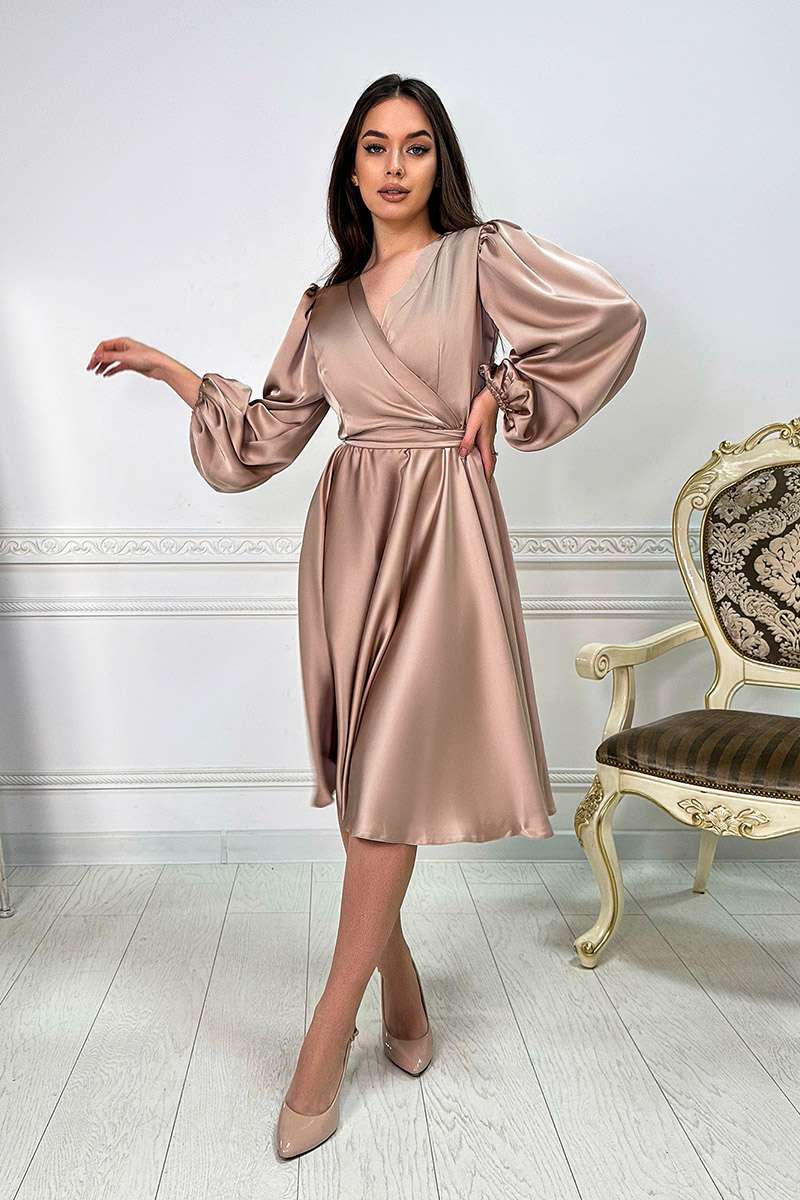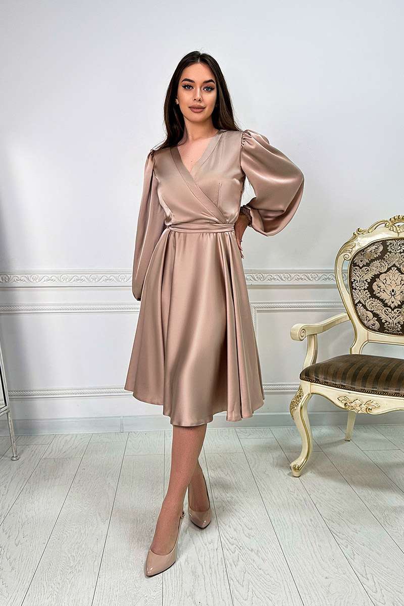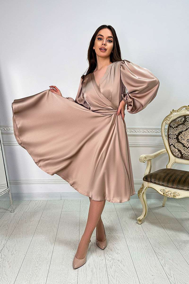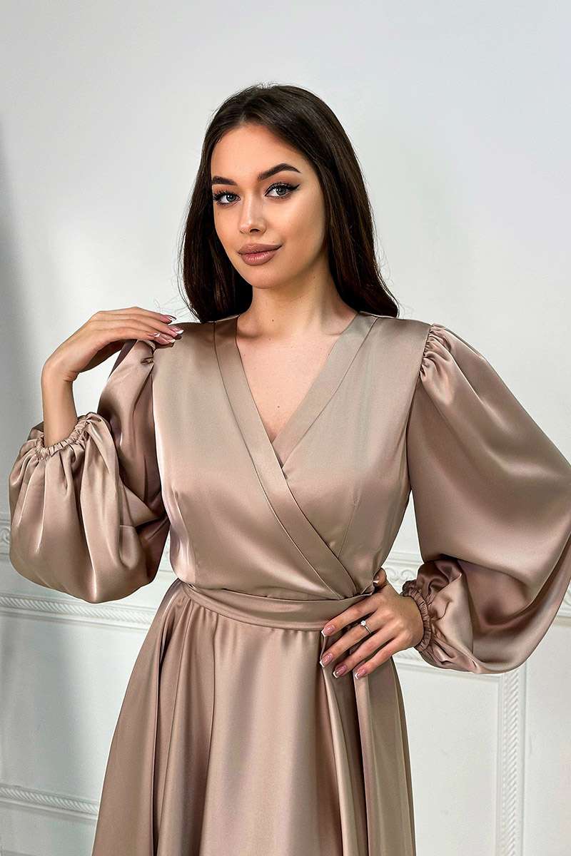 Одягніть Бежева Коктейльна шовкова сукня запах 24008 і відчуйте себе справжньою музою, яка з легкістю вносить гармонію та красу в кожен свій день.