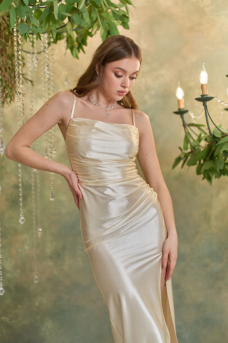 Догляд: Атласна тканина вимагає дбайливого догляду. Рекомендується делікатне прання у холодній воді або сухе чищення, щоб зберегти бездоганний вигляд сукні. Прасувати лише з вивороту при низькій температурі.