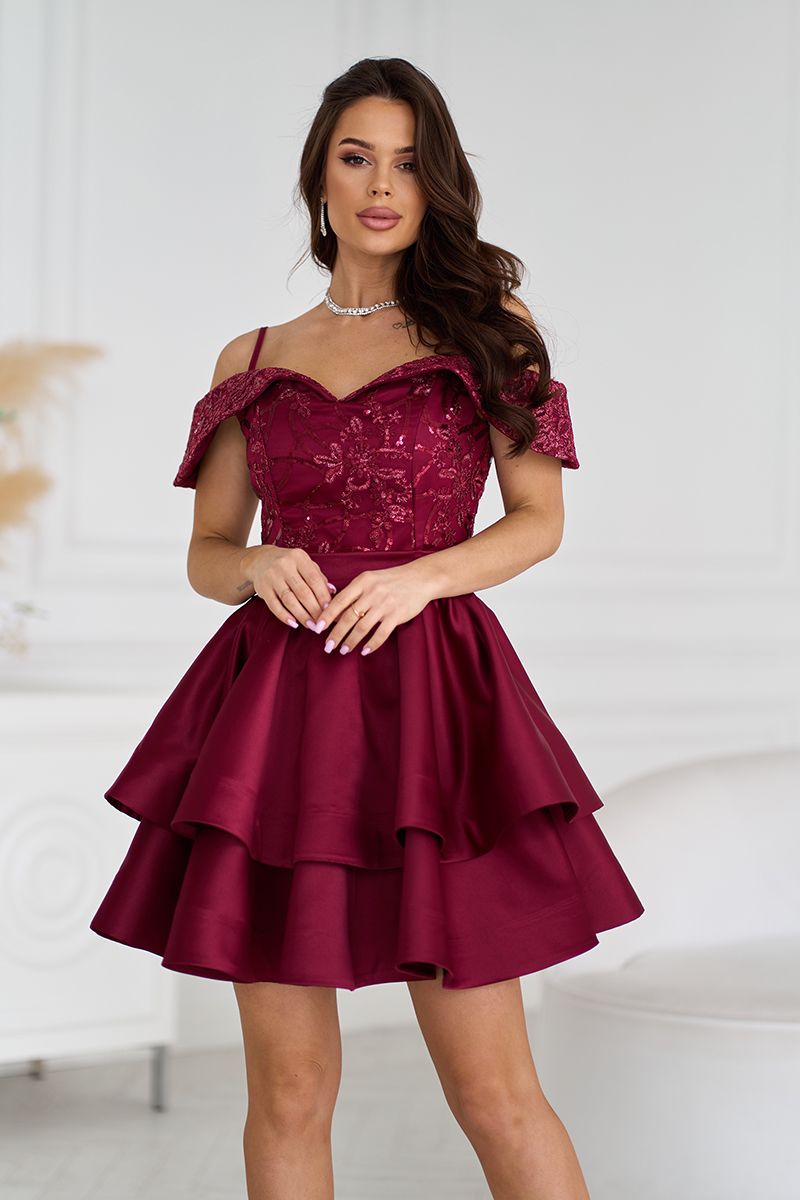 Бордова Коктейльна Сукня Атлас Паєтка Відкриті Плечі 25023 – це втілення елегантності та чарівності. Верх виконаний із сітки з розкішною вишивкою та блискучими паєтками, які створюють витончений малюнок. Пишна багатошарова спідниця з прокатного атласу надає образу граційності та легкості, а відкриті плечі та витончені бретелі роблять сукню ще більш ефектною. Завдяки поясу в комплекті можна підкреслити талію, створюючи ідеальний силует.