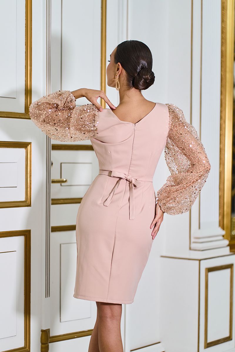 Бежева Коктейльна Сукня Бісерні Рукави 24056 – ідеальний вибір для тих, хто шукає елегантність і стиль в кожній деталі. Виготовлена з костюмного крепу преміум якості, ця сукня відзначається вишуканими рукавами з прозорої сітки, які розшиті бісером, перлами та паєтками, додаючи образу особливого шарму. Потайна блискавка на спинці забезпечує зручність та ідеальну посадку.