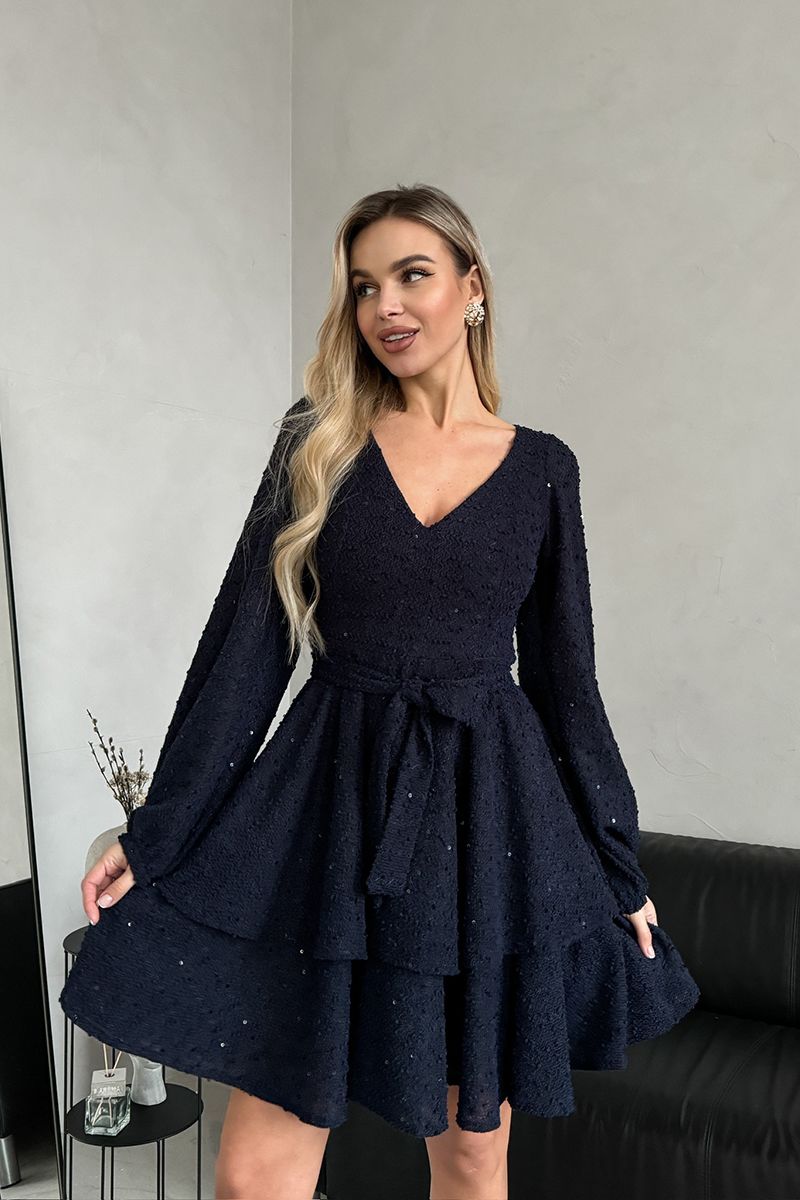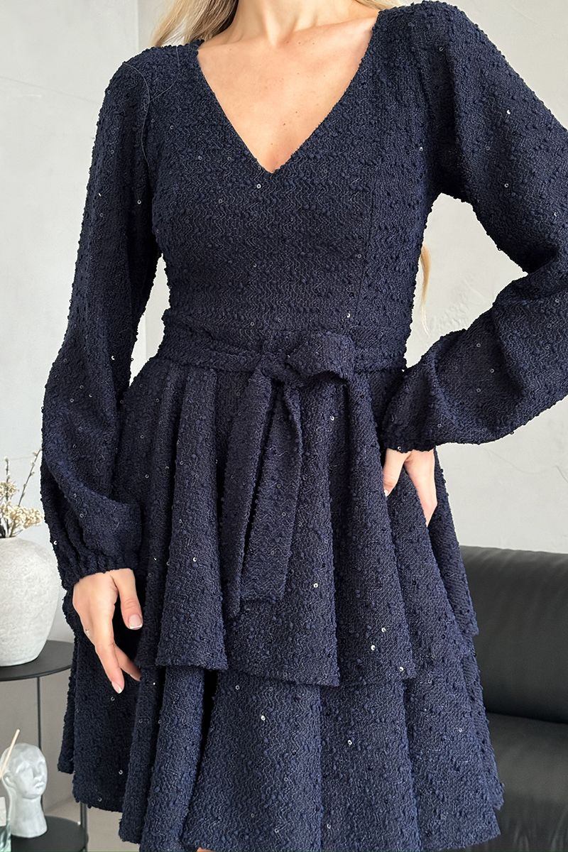 Синя Коктейльна Сукня Букле Волани 24110 — це вишуканий вибір для урочистих подій та святкувань. Сукня виготовлена з фактурного букле трикотажу, доповненого рідкими прозорими пайєтками, які надають легкий блиск. Цей матеріал забезпечує комфорт та відчуття розкоші.