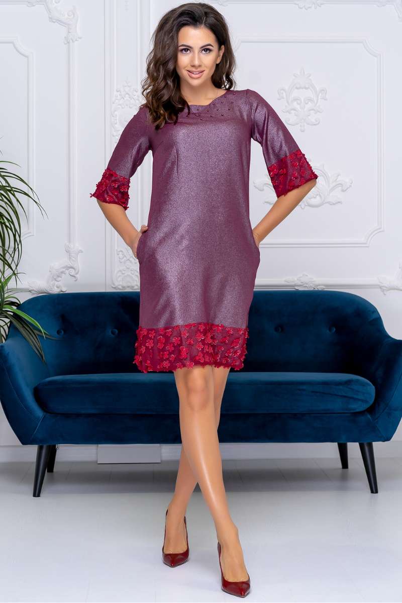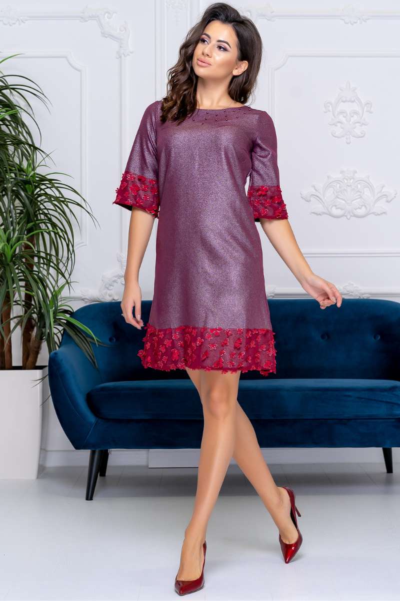 Бордова Коктейльна сукня футляр блиск 9175 — елегантна та стильна модель, що підкреслить вашу жіночність та чарівність. Тканина з костюмного крепу з блиском надає сукні вишуканості, а декор у вигляді крупного бісеру додає оригінальності. Рукави та низ плаття декоровані сеткою з 3D аплікацією, потайна молнія по спинці забезпечує комфортне одягання.