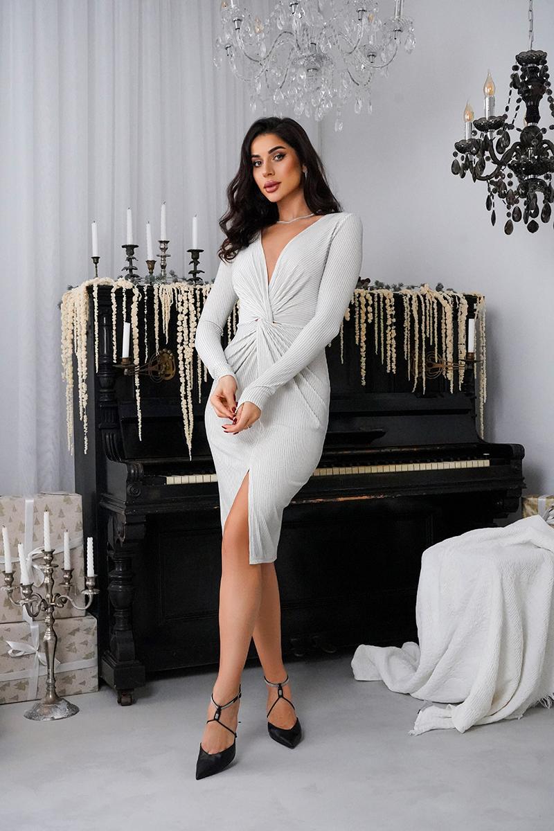 Молочна Коктейльна сукня Люрекс Блиск 24099 – ідеальний вибір для вечірок та урочистих подій. Ця сукня з люрексової гофрованої тканини створена для того, щоб підкреслити ваші жіночні форми. Витончений блиск, глибокий V-подібний виріз і стильний передній розріз додають образу особливої чарівності. Доступна в розмірах S – 2XL.