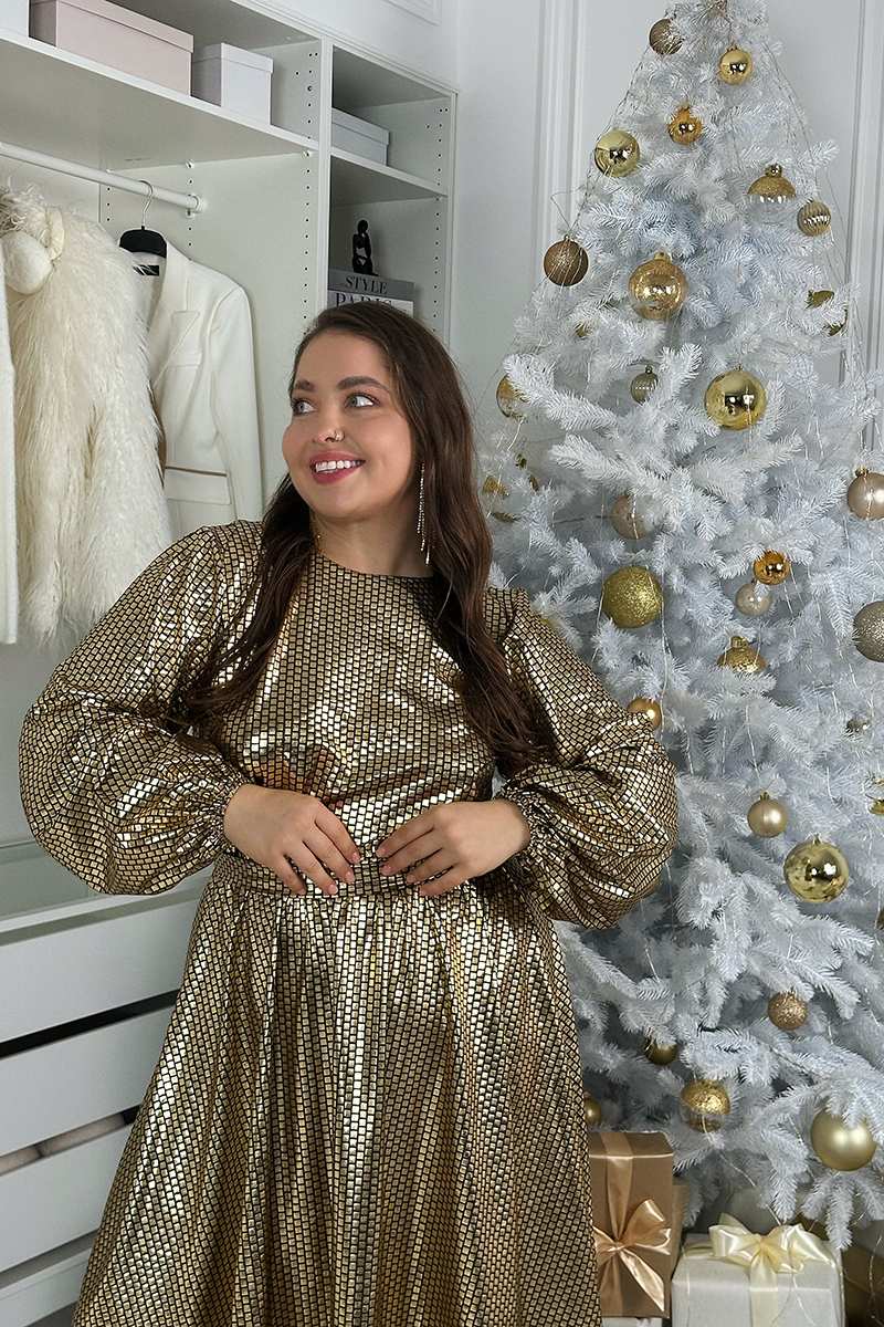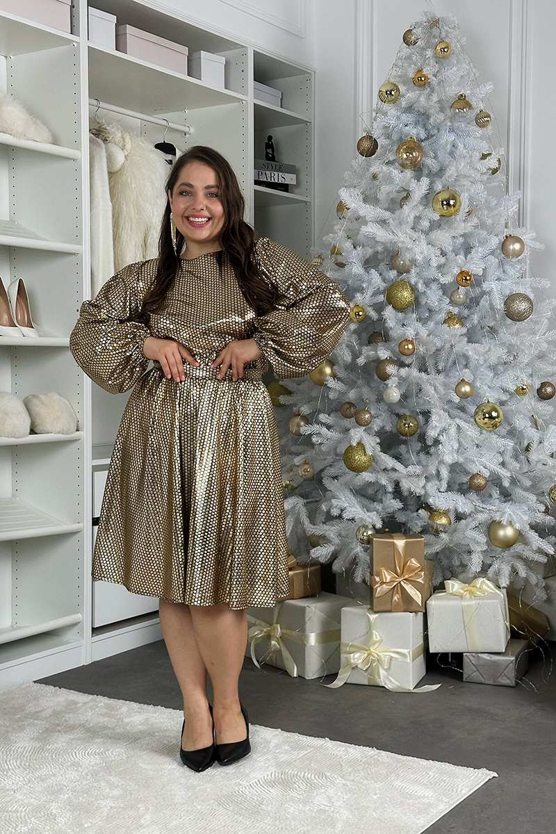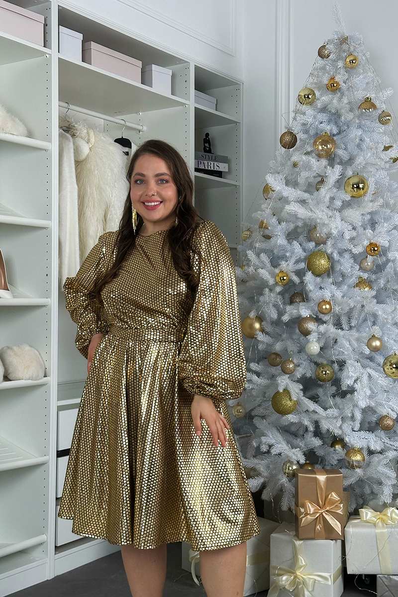 Золота Коктейльна сукня металік міді 24122 стане не просто ефектним акцентом гардероба, а й універсальним рішенням для всіх урочистих подій. Вільний крій не сковує рухів, а блискуча текстура створює візуальний ефект стрункішої фігури. Якщо ви шукаєте плаття, яке не потребує складного стилінгу, виглядає дорого та комфортно в носінні — це саме те, що треба. Сукня доступна у розмірах L – 3XL, тому легко підібрати ідеальну посадку для фігури plus size. А завдяки поясу можна регулювати акцент на талії, приховуючи можливі нюанси силуету.