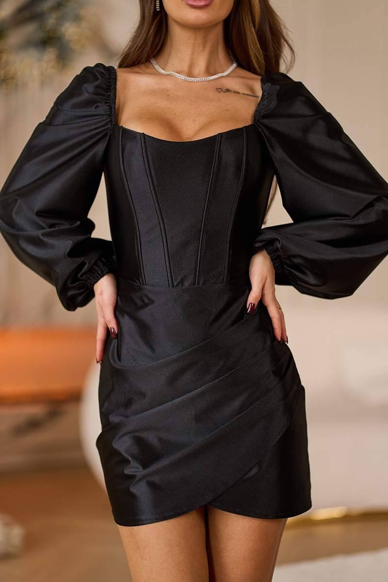 Чорна Коктейльна сукня міні атлас корсет 25098 — це втілення елегантної спокуси та новорічного шику. Сукня виготовлена з розкішного атласу-біфлексу, який м’яко підкреслює вигини фігури та виблискує при світлі. Корсетна верхня частина з формуючими кісточками створює ідеальну лінію декольте, а довгі об’ємні рукави з м’якою резинкою на плечах і манжетах додають аристократичної вишуканості. Потайна блискавка на спинці забезпечує зручну посадку, а асиметричне драпування спідниці додає образу динаміки. Модель доступна у розмірах XS, S, M, L і представлена в кольорах: червоний, зелений, чорний, коричневий.