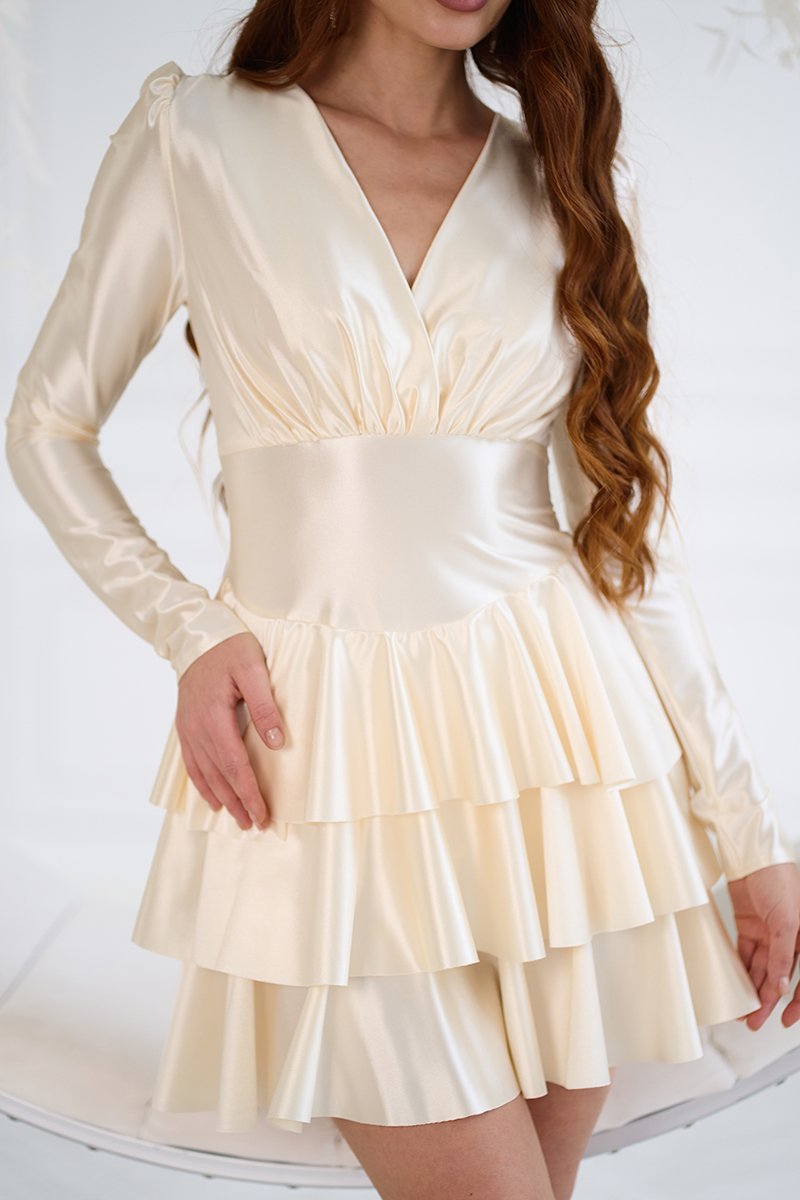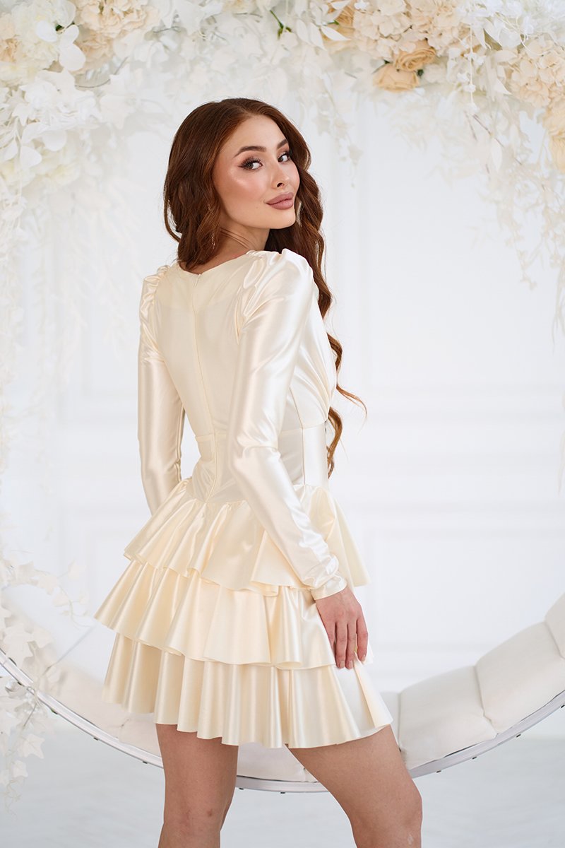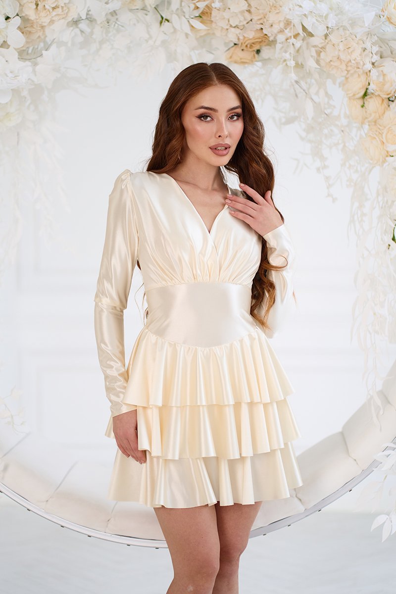Кремова Коктейльна сукня міні атласна 25084 — це сукня, яка не просто прикрашає, а створює настрій. Вона вдало підкреслює талію завдяки щільному поясу, приховує можливі недоліки завдяки воланам, а завдяки атласному блиску робить образ дорогим і завершеним. Якщо ви шукаєте ефектну, але не викличну сукню, що дарує впевненість у собі та виглядає ідеально як наживо, так і на фото — ця модель стане вашим фаворитом.