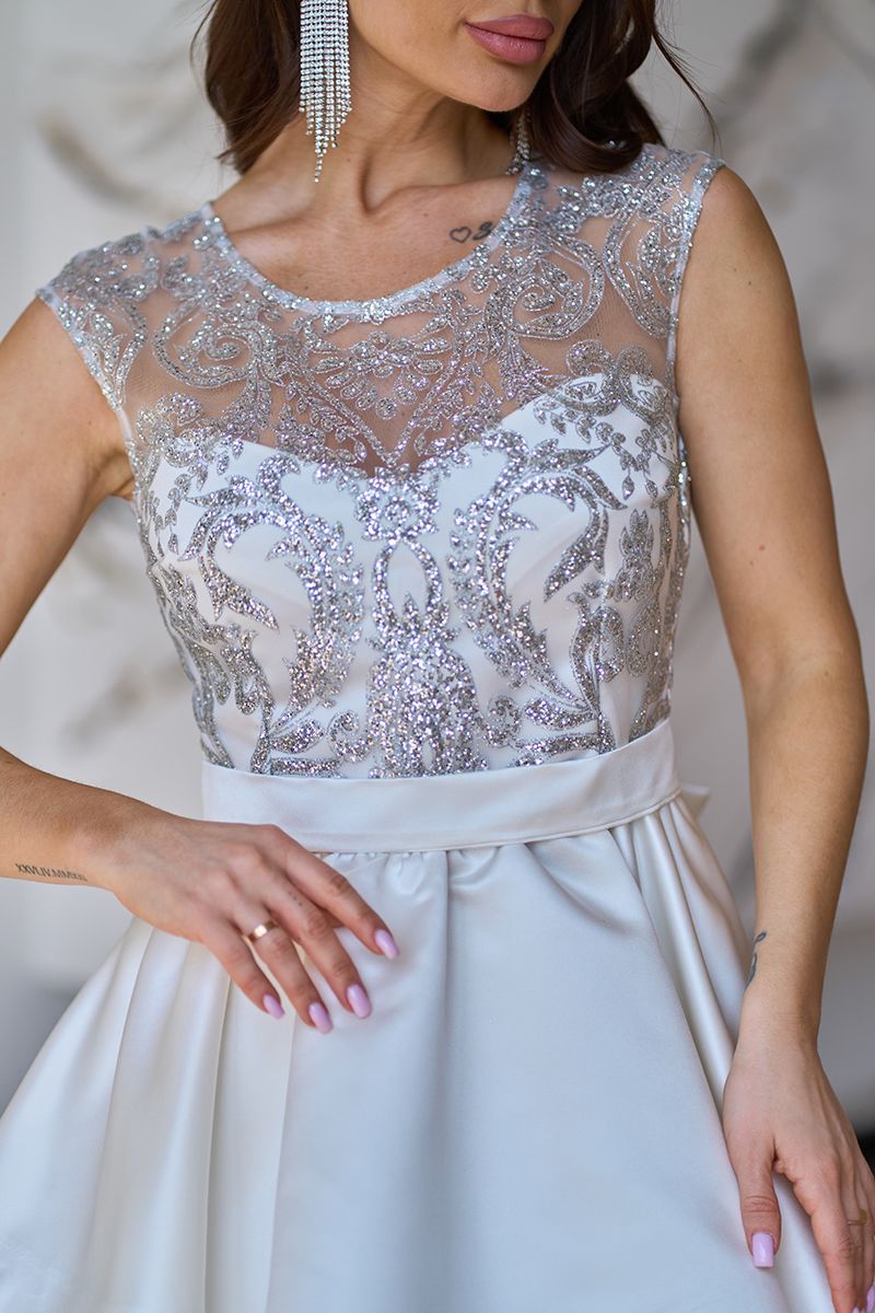 Верх сукні виконаний із напівпрозорої сітки, оздобленої візерунком із глітеру. Такий декор створює ефект дорогого мережива, красиво підкреслює зону декольте, плечі та лінію спини, а також додає образу виразності без перевантаження. Молочна основа в поєднанні з теплим блиском виглядає дуже святково та благородно.