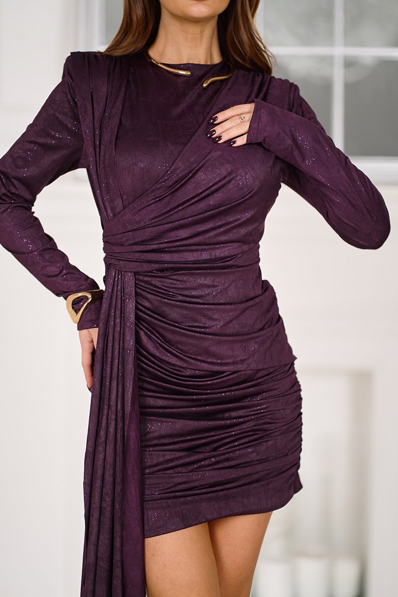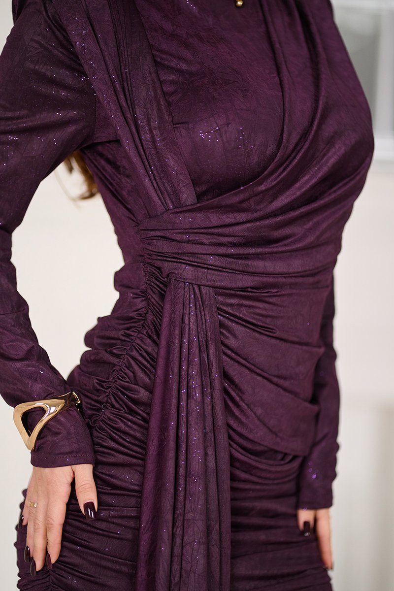 Сливова Коктейльна сукня міні мокрий блиск 25092 — це втілення впевненості та магнетизму в одному образі. Завдяки елегантному крою та фактурній тканині з візуальним ефектом «мокрого блиску» ця сукня ідеально підкреслює жіночні форми та додає загадковості. Драпірування в області талії, асиметричний поділ та м’які плечики формують гармонійний силует. Потайна блискавка ззаду забезпечує комфортне одягання, а блискучі частинки у складі тканини делікатно вловлюють світло під час руху.