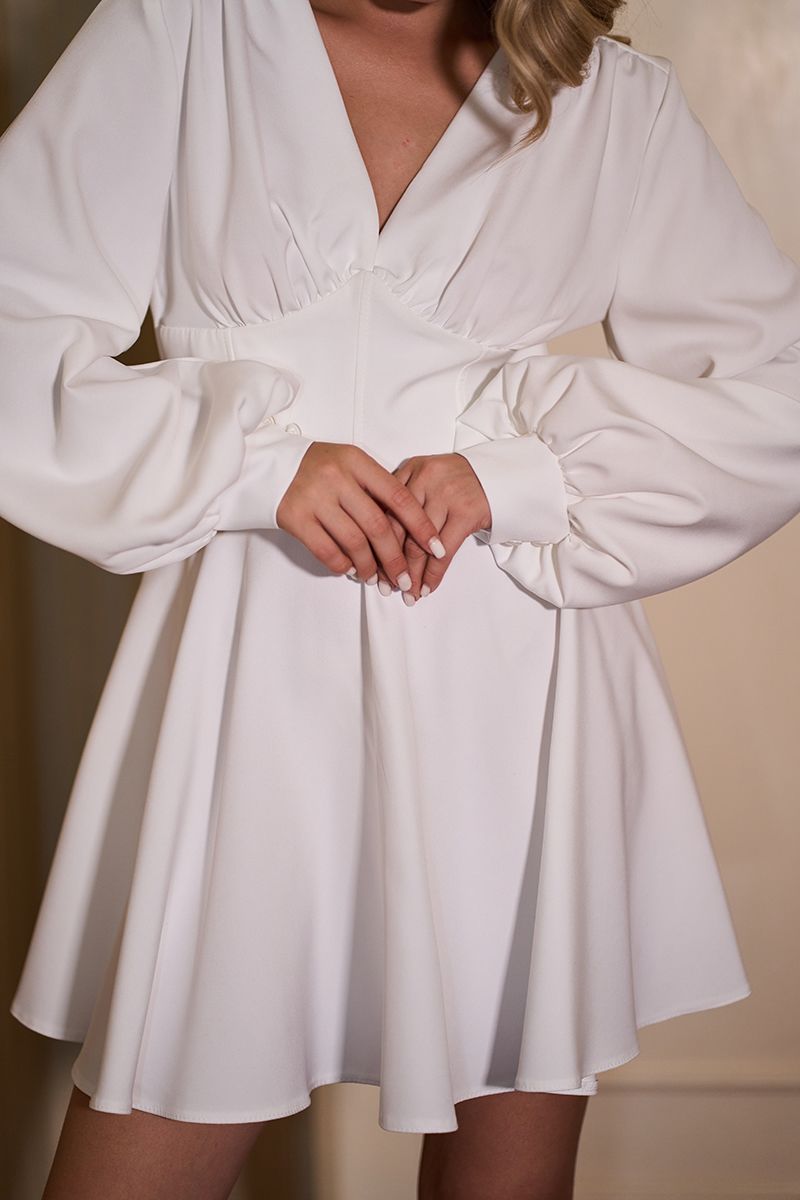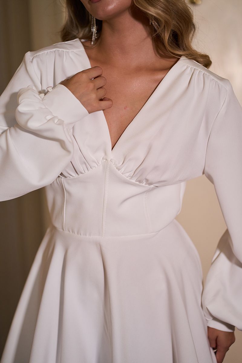 Молочна Коктейльна сукня міні з довгим рукавом 25074 — це втілення ніжності та елегантності. Легка текстура костюмного крепу підкреслює витонченість ліній, а V-подібне декольте візуально видовжує силует. Пишні довгі рукави на манжетах із двома гудзиками додають образу вишуканості та романтичності. Потайна блискавка по спинці забезпечує ідеальну посадку та комфорт. Доступна в розмірах S, M, L.
