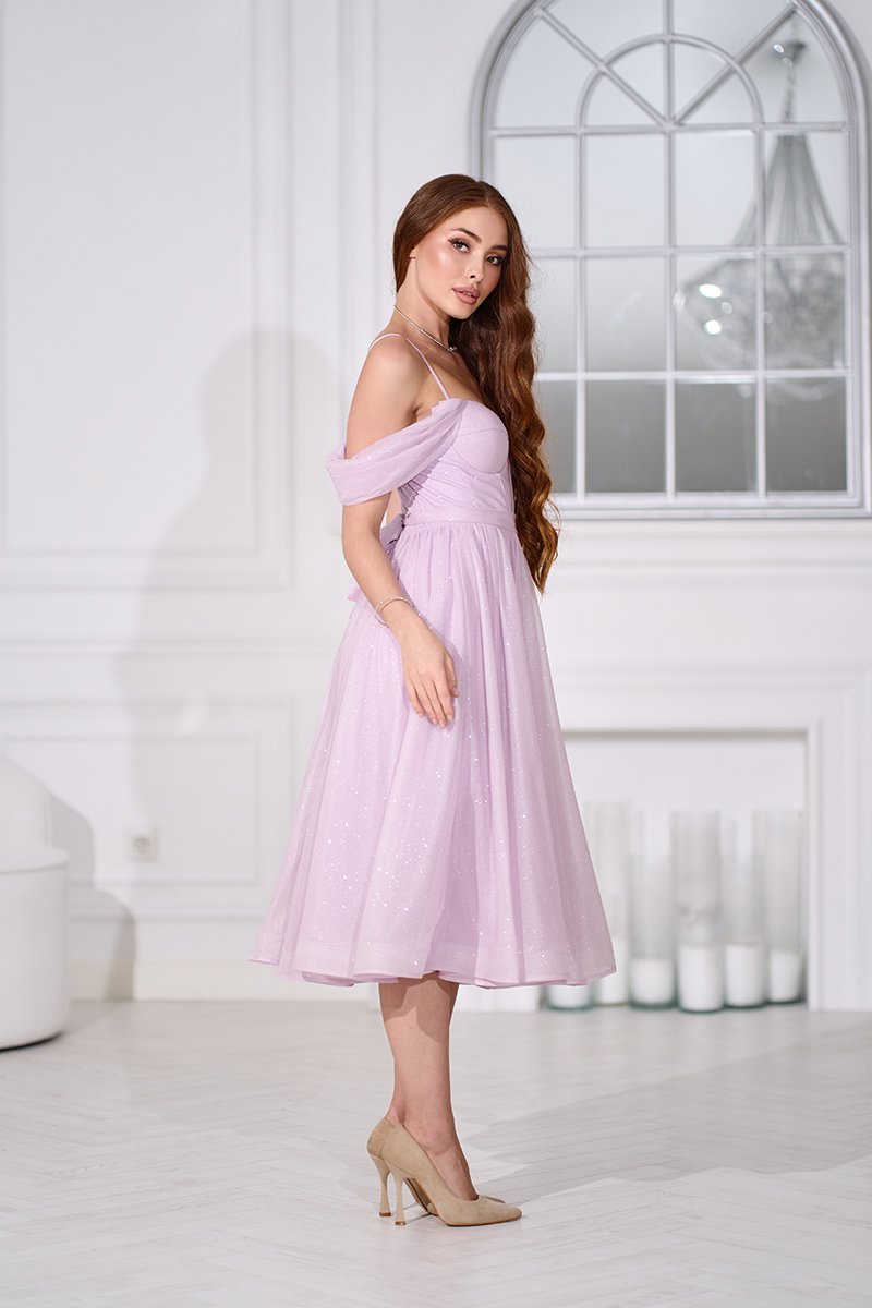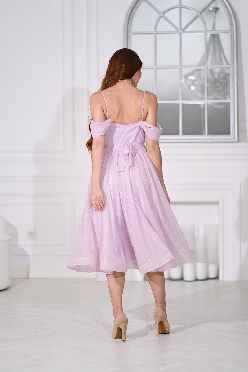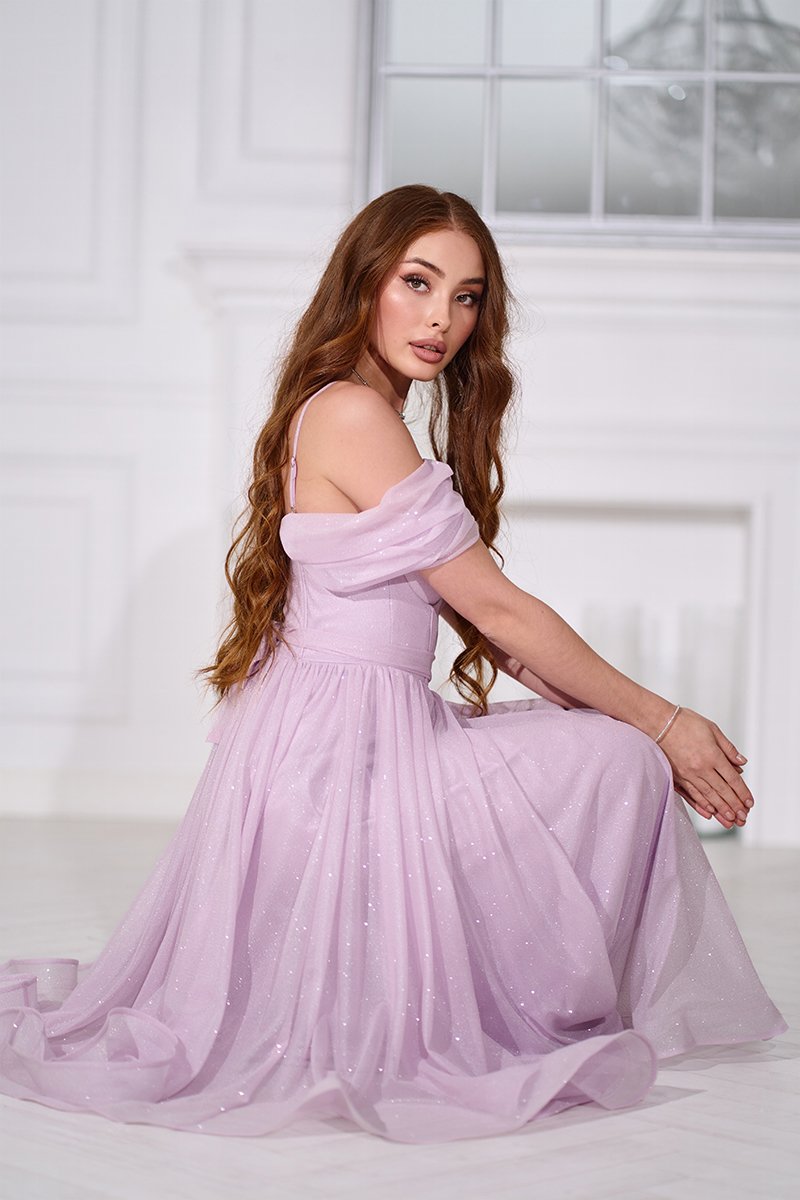 Порада стиліста: лавандовий відтінок особливо ефектно виглядає в поєднанні зі срібними або нюдовими аксесуарами. Оберіть босоніжки або туфлі на підборах, додайте витончені сережки та легкий блиск у макіяжі — і образ виглядатиме дорого та гармонійно.