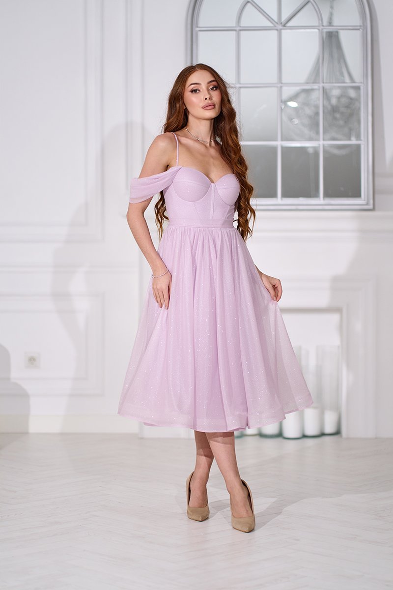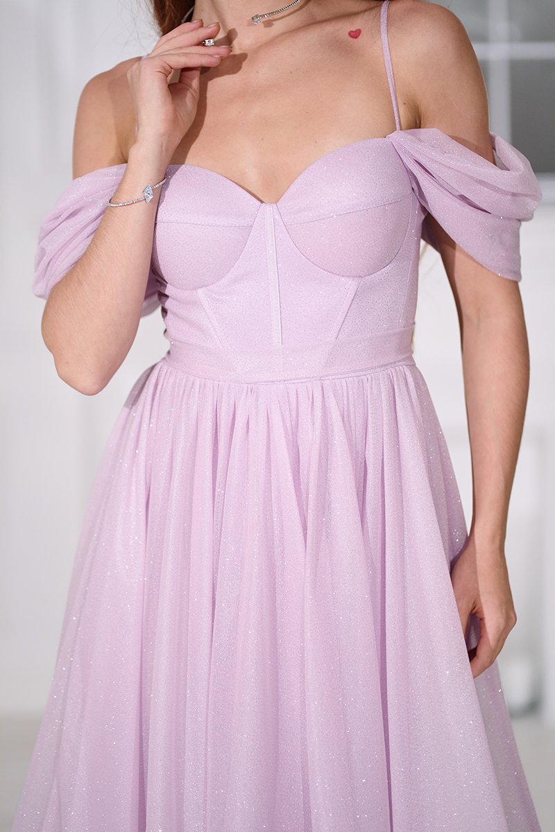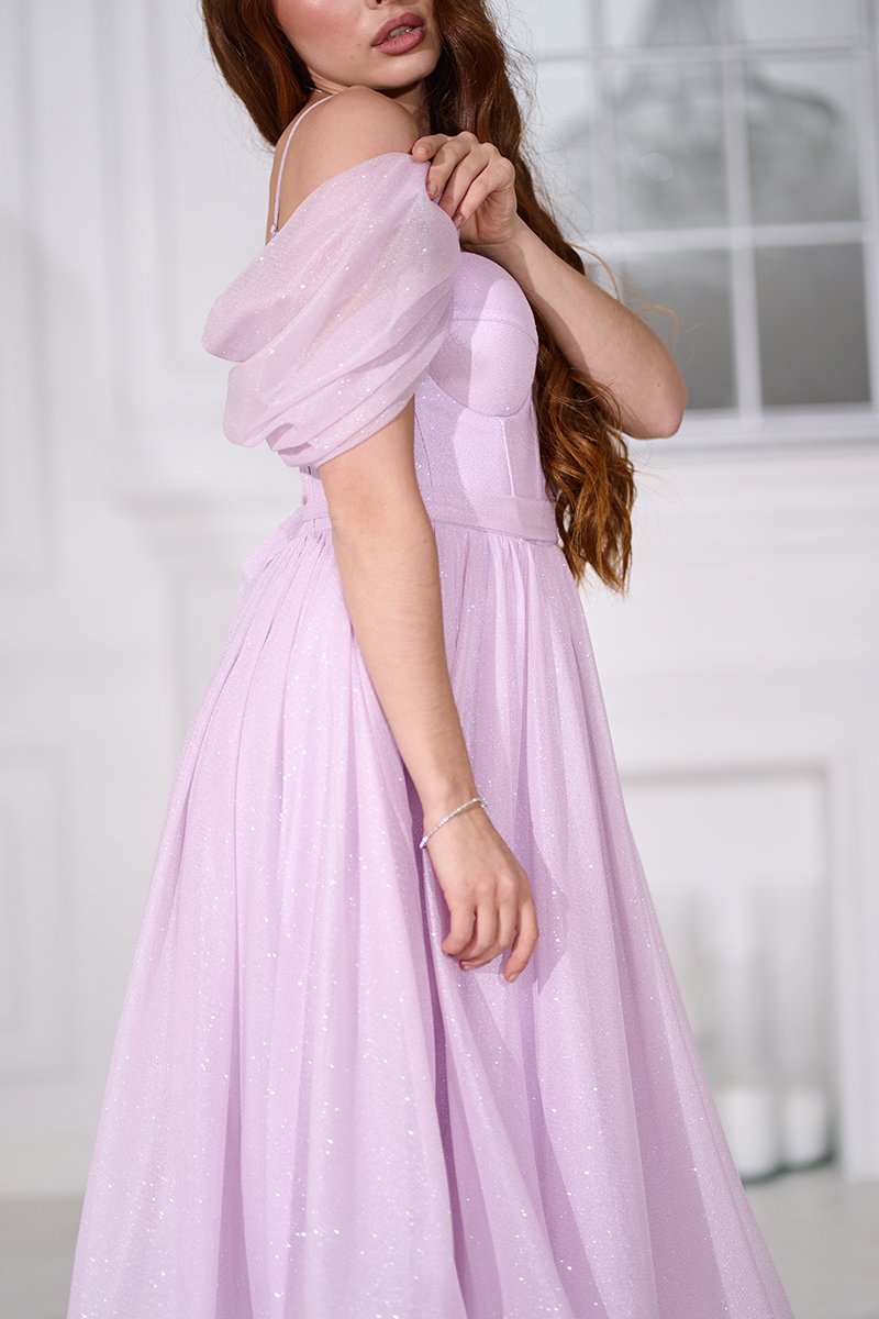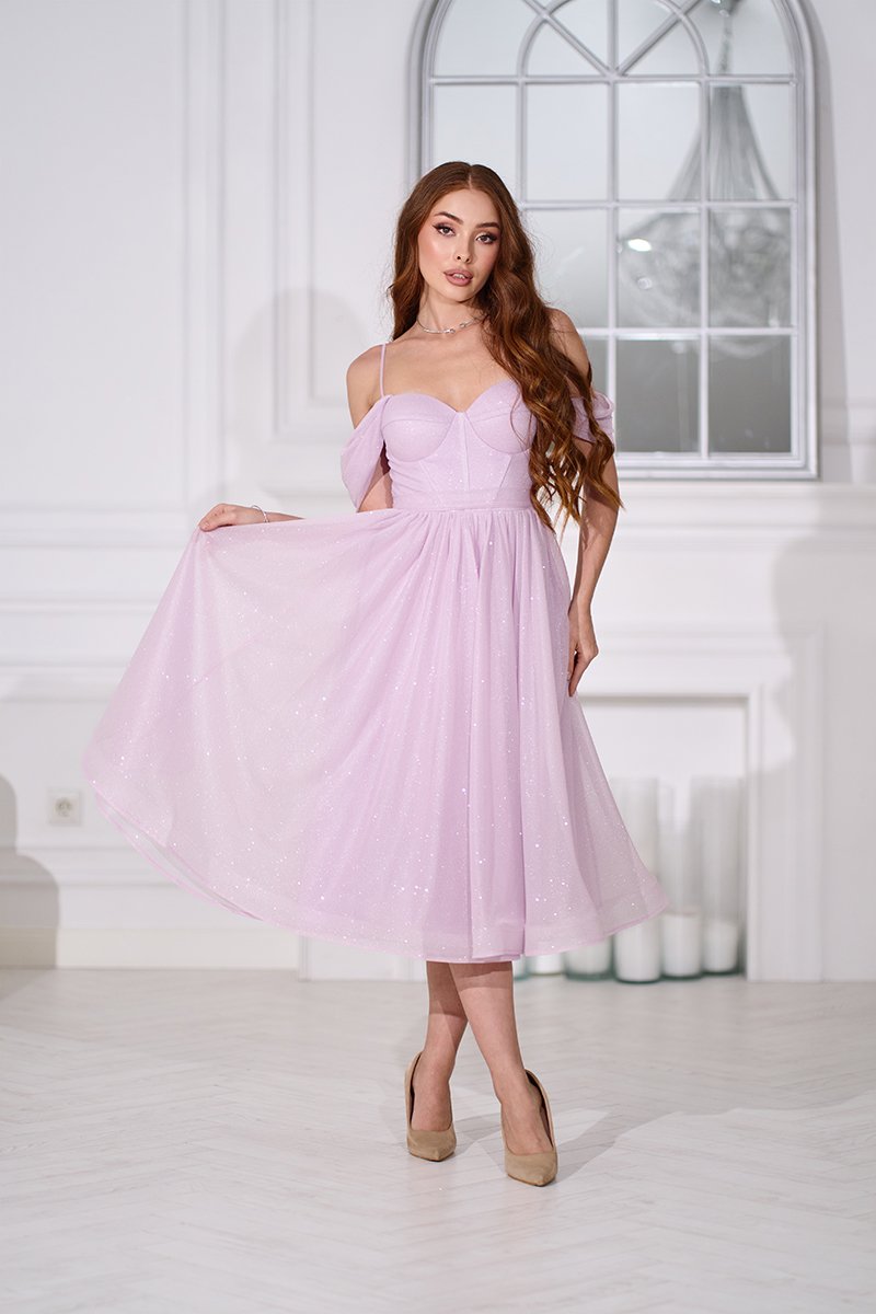 Порада стиліста: лавандовий відтінок особливо ефектно виглядає в поєднанні зі срібними або нюдовими аксесуарами. Оберіть босоніжки або туфлі на підборах, додайте витончені сережки та легкий блиск у макіяжі — і образ виглядатиме дорого та гармонійно.