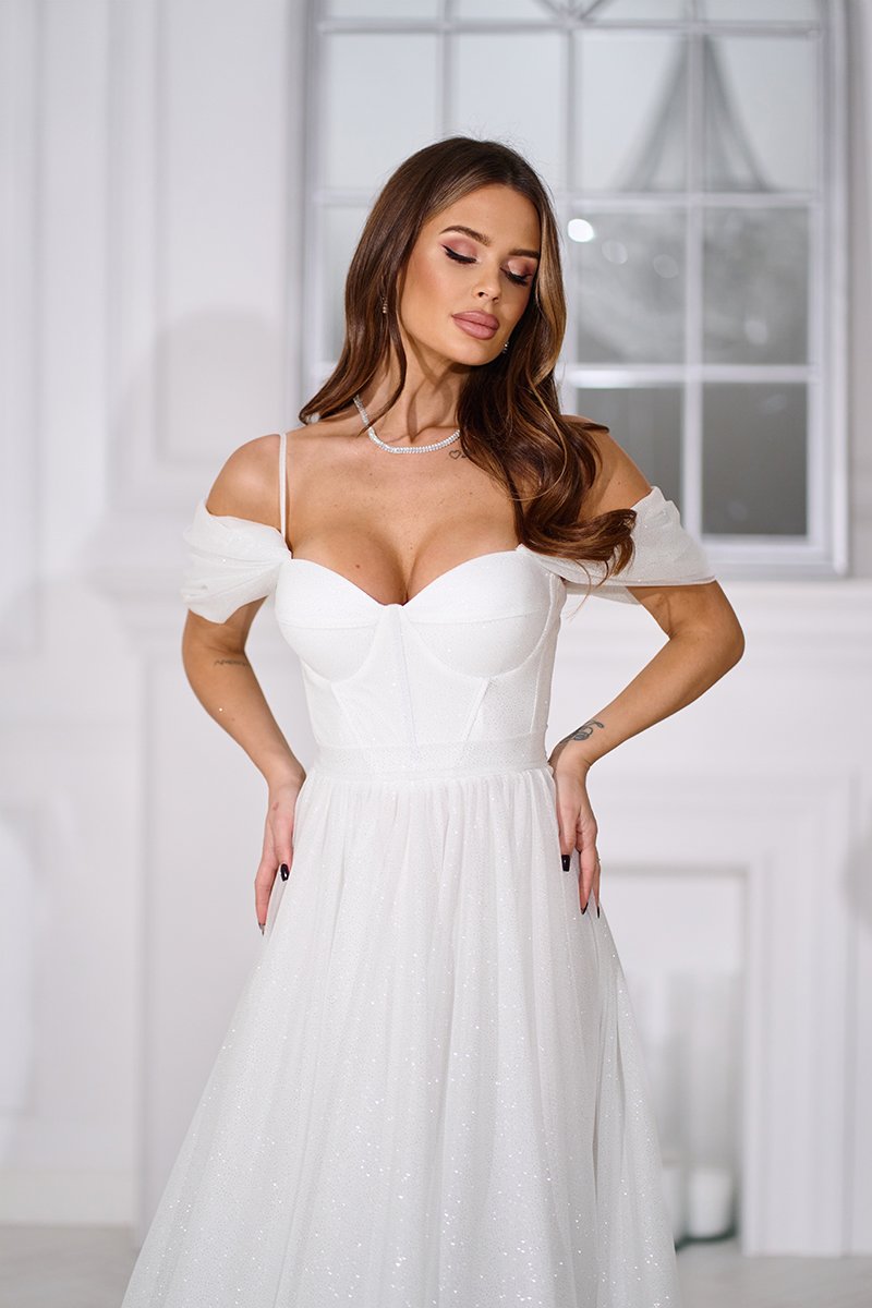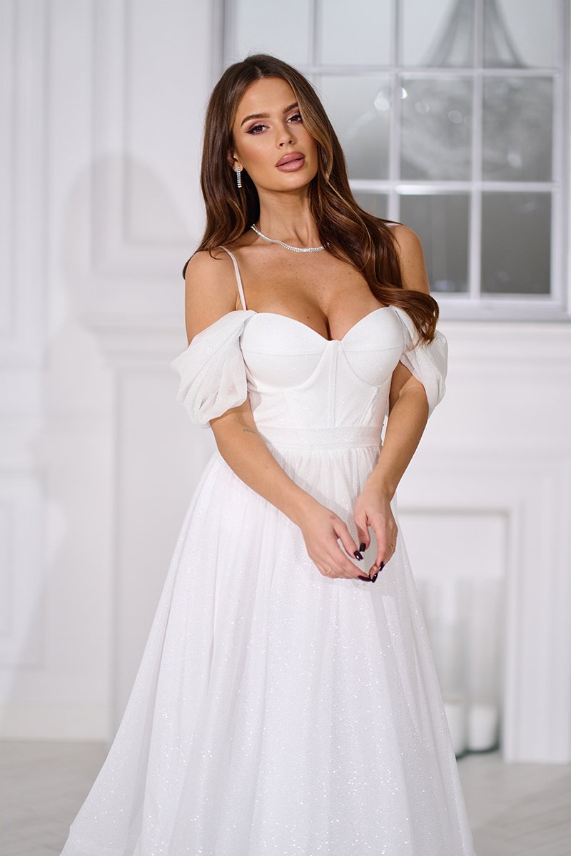 Повітряний шифон з м’яким блиском красиво рухається разом із вами, додаючи легкості кожному кроку. Ліф із формованими чашками та корсетними кісточками формує витончений силует і забезпечує надійну підтримку без потреби у додатковій білизні. Драпіровані спущені рукави делікатно відкривають плечі, створюючи романтичний і водночас сучасний образ.