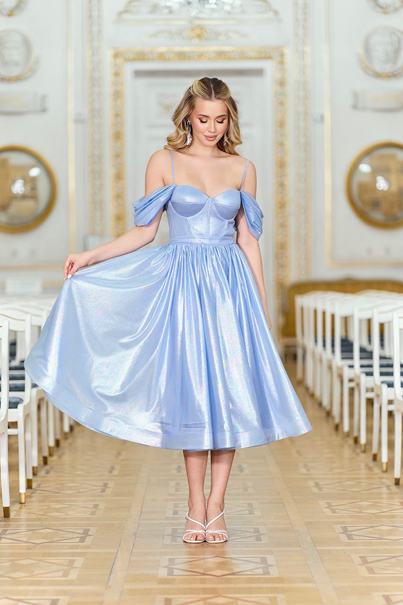Поєднуйте сукню зі срібними або нюдовими босоніжками та витонченими прикрасами. Для більш виразного образу оберіть сережки з камінням. Волосся — легкі хвилі або гладкий пучок для акценту на плечах.