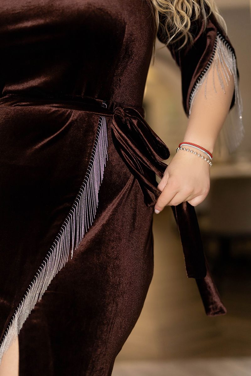 Коричнева Коктейльна Сукня Оксамит Бахрома 21131 застібається на таємну блискавку. Максимально ефектно ця модель виглядає із взуттям на підборах.
