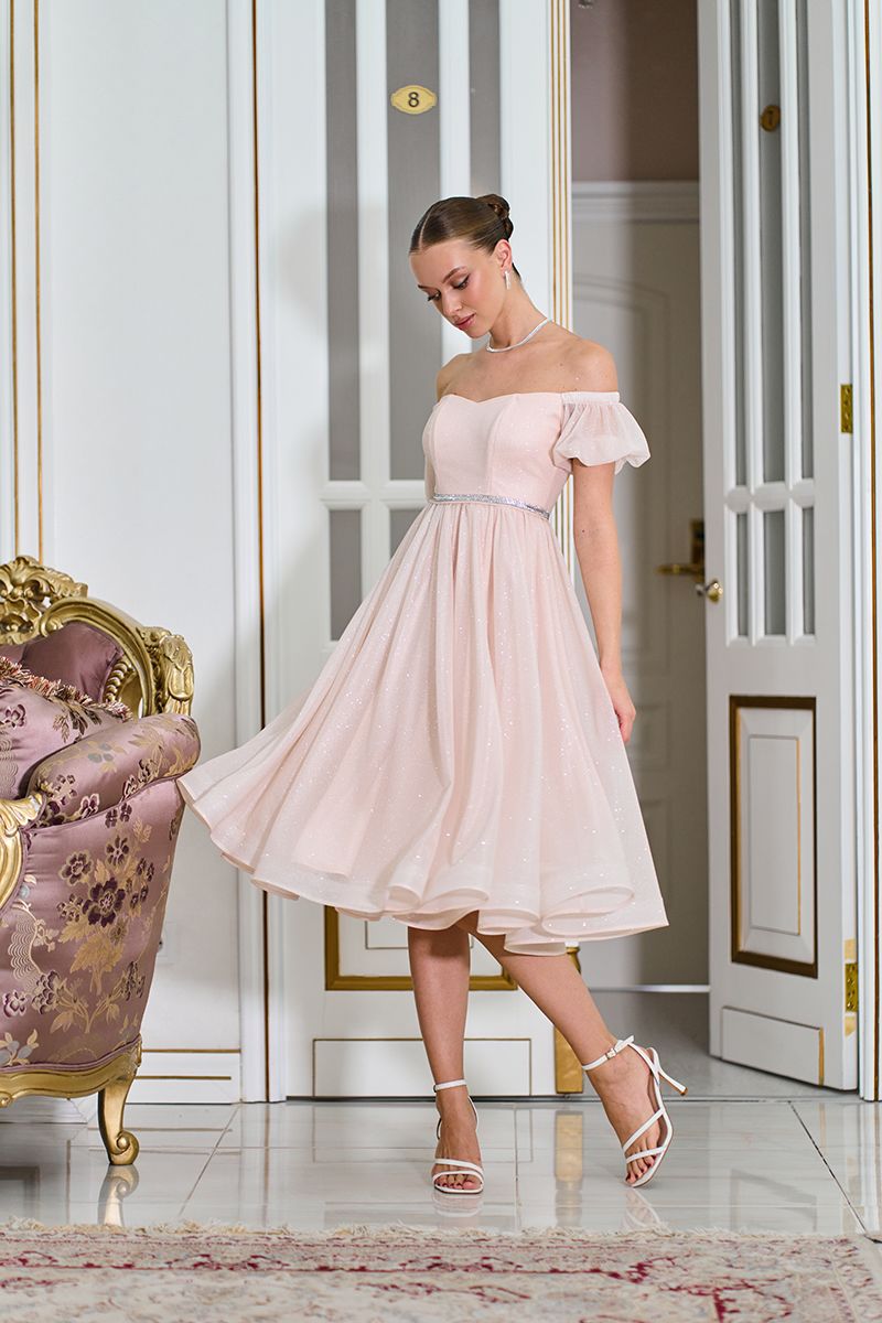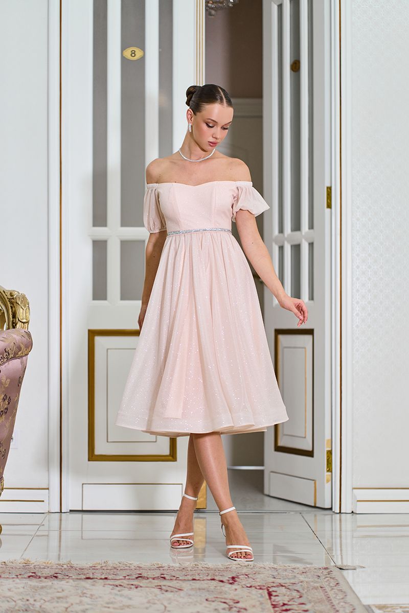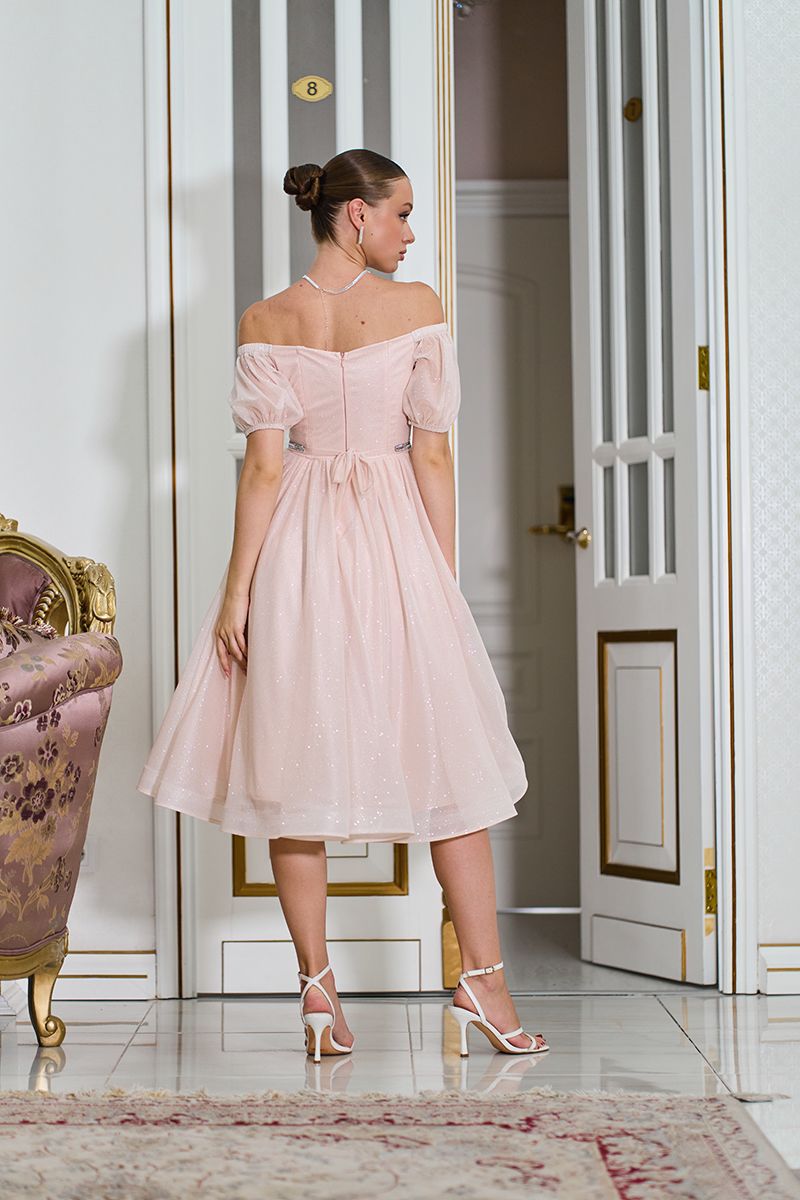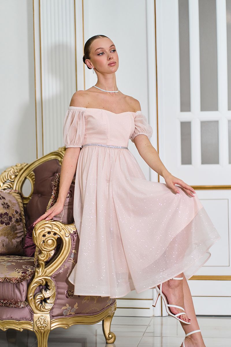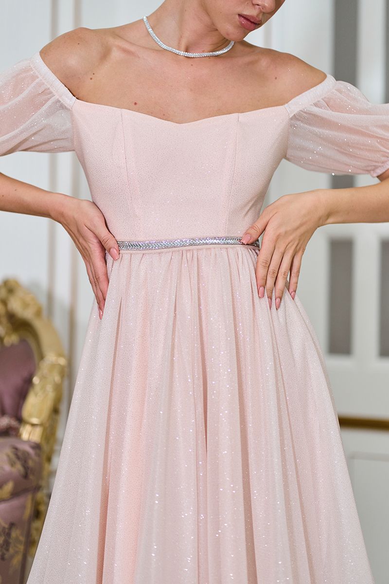 Порада стиліста: ця модель чудово поєднується з босоніжками на підборах та елегантними сережками. Зачіска з відкритими плечима — ідеальний варіант, щоб продемонструвати романтичний виріз сукні. Оберіть ніжний макіяж із блиском на очах або губах — він перегукуватиметься з переливами тканини та поясом.