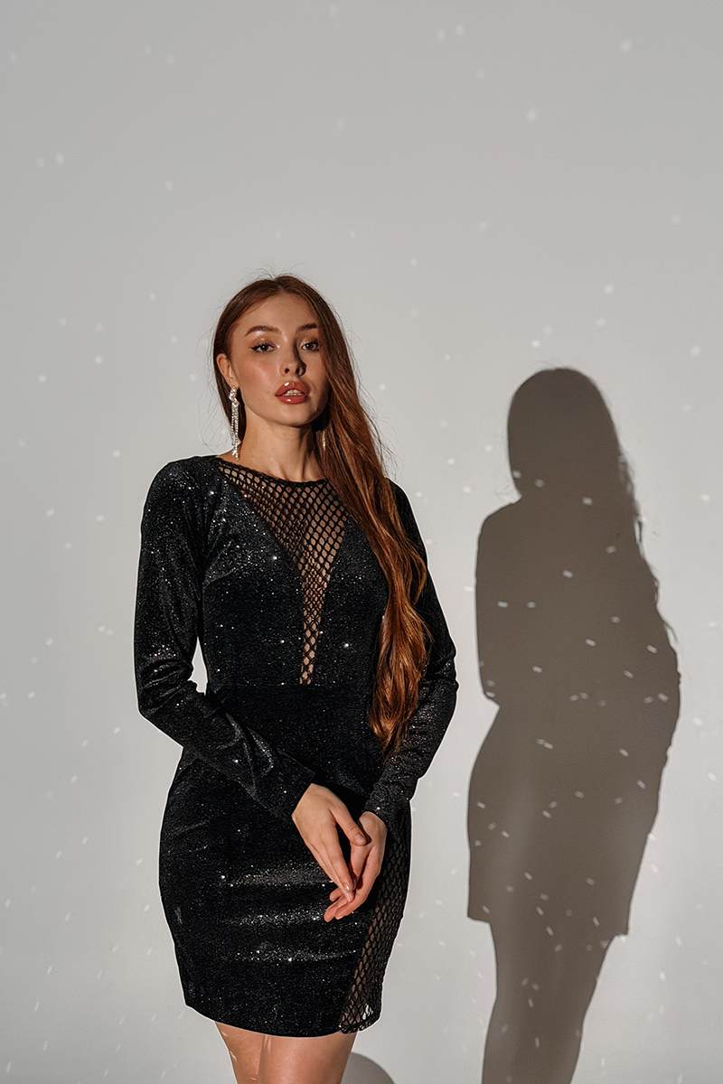 Чорна Коктейльна сукня сяючий оксамит 25101 — це уособлення зухвалої розкоші й святкового настрою. Сукня виготовлена з м’якого блискучого оксамиту, який при кожному русі вловлює світло, створюючи ефект зоряного пилу. Прозорі вставки з великої сітки з глітером додають драматичності та сміливості, підкреслюючи фігуру та привертаючи захоплені погляди. Модель має довгі рукави, ідеальний приталений силует та зручну потайну блискавку на спинці. Довжина — вище коліна, що робить її актуальною як для новорічних свят, так і для вечірок у стилі коктейль.