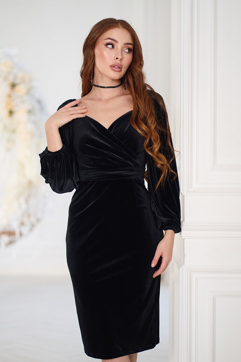 Чорна Коктейльна Сукня Відкриті Плечі 24095 – це вишукана коктейльна сукня, яка підкреслить вашу елегантність та жіночність. М’який оксамит дбайливо облягає фігуру, надаючи їй привабливого силуету. Особливість моделі – відкриті плечі та рукави, зібрані на резинку, що додає образу граційності та витонченості. Потайна блискавка на спинці та шліца на спідниці ззаду забезпечують комфорт та легкість у русі. Сукня доступна в розмірах S – 4ХL.