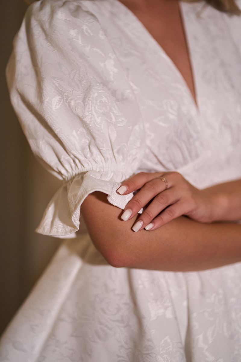 Поєднуйте цю сукню з білими босоніжками на підборах або нюдовими туфлями, додаючи витончені сережки з перлами або блискучі ланцюжки. Молочний відтінок жаккарду вишукано виглядає як з класичними, так і з акцентними аксесуарами. Вдалий вибір для образу нареченої на розпис, подружки нареченої або для урочистої події з дрес-кодом cocktail.