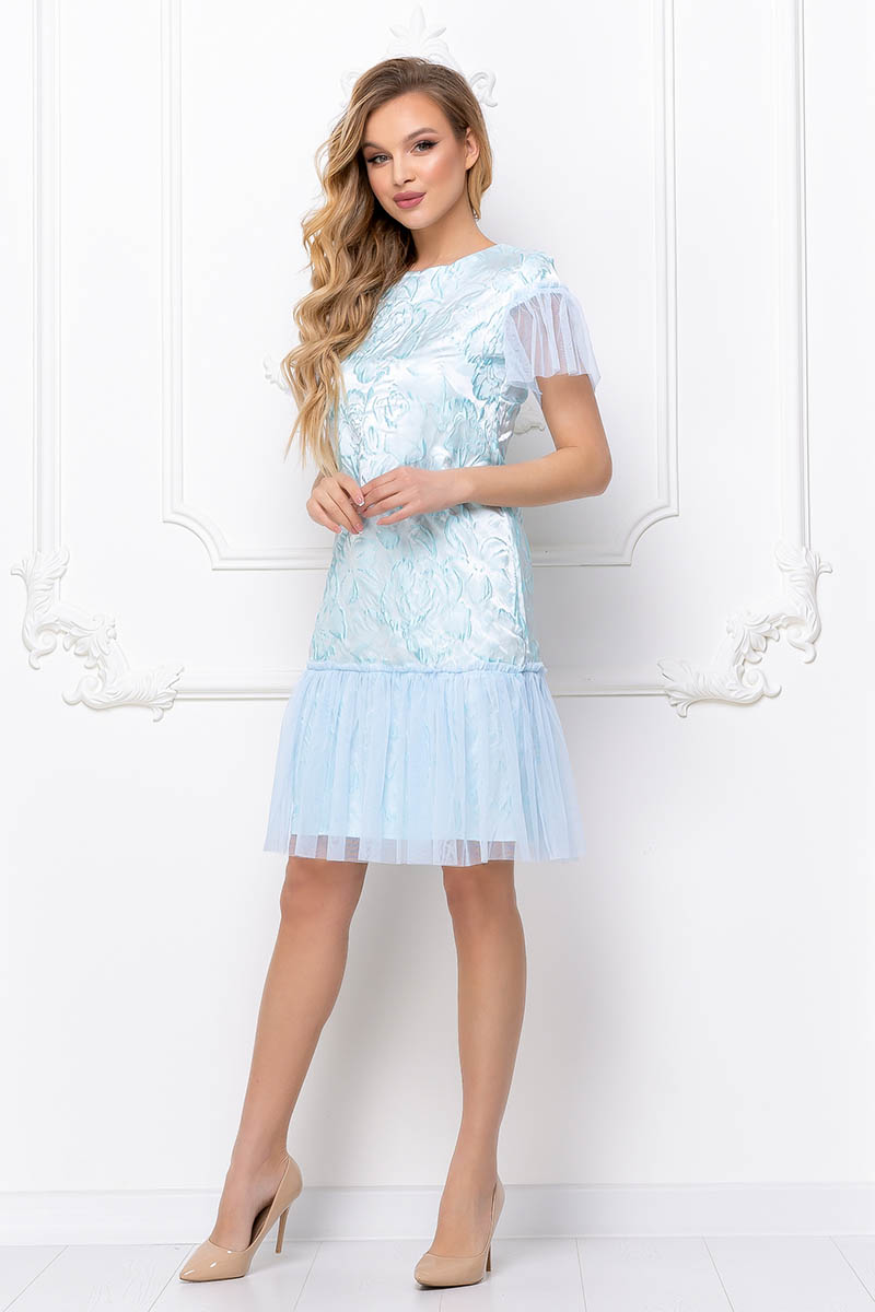 Блакитна Коктейльна Сукня жакард парча 8074 – це витончений вибір для особливих подій. Сукня виготовлена з високоякісної тканини жаккард/парча, яка створює ефектний блиск і елегантність. Рукава та низ сукні декоровані легкою прозорою сіткою, що додає образу легкості та грайливості. Потайна молнія по спинці забезпечує зручність і ідеальну посадку по фігурі. Ця сукня стане прекрасним доповненням до вашого гардеробу, підкресливши вашу жіночність і вишуканий смак.