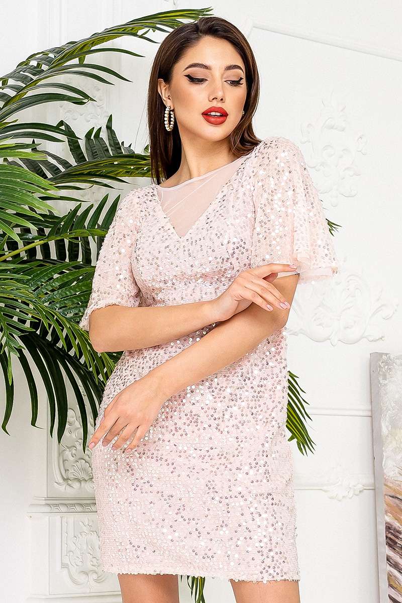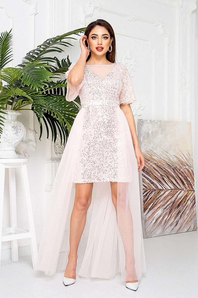 Напівобтисле коротке плаття, довжиною вище коліна має короткий подвійний рукав, що летить, і V-подібний виріз, декорований прозорою сіткою.