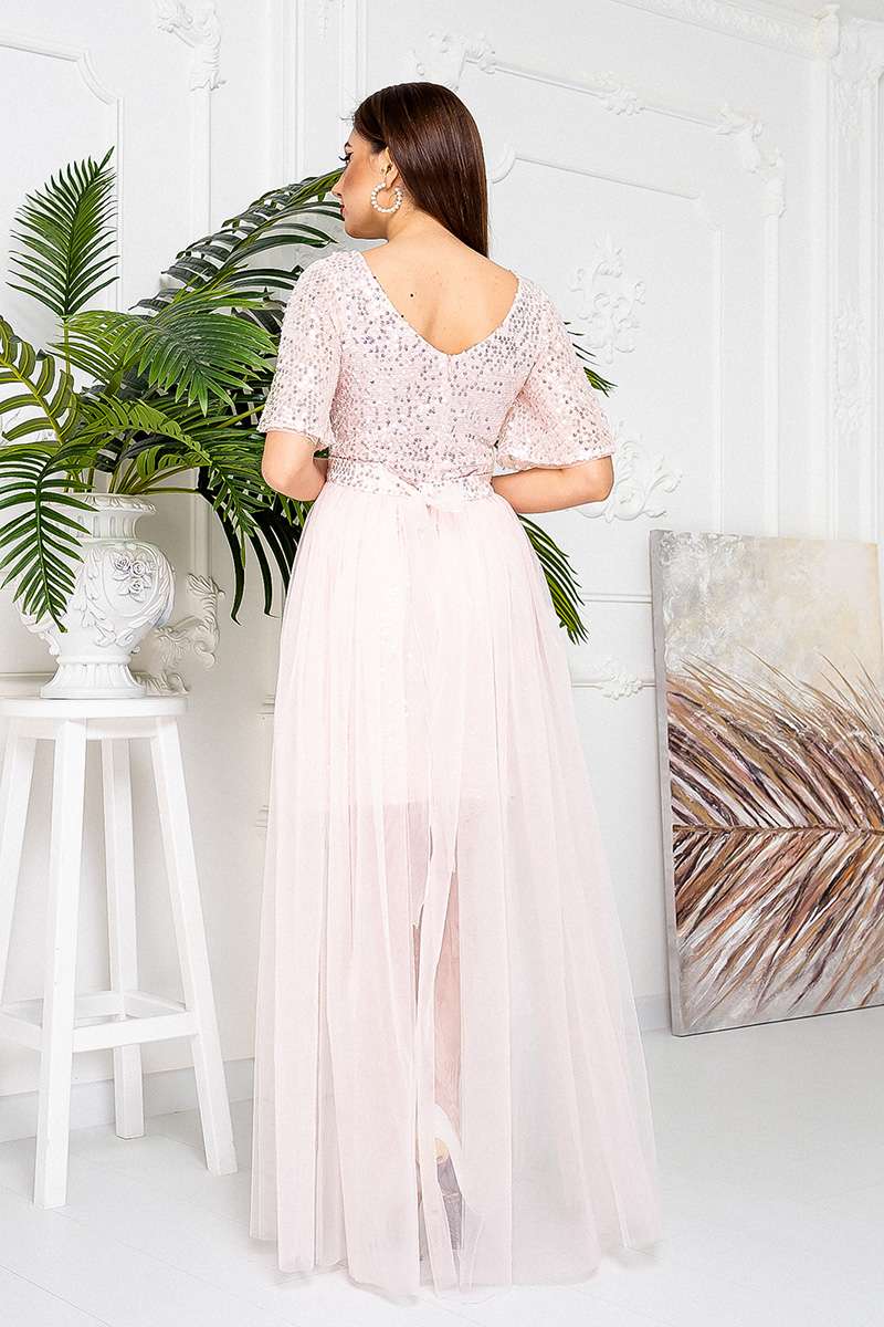 У Коктейльна Сукня Знімна Спідниця 21033 Рожева передбачена друга спідниця в підлогу з прозорої тканини на поясі з паєтками.