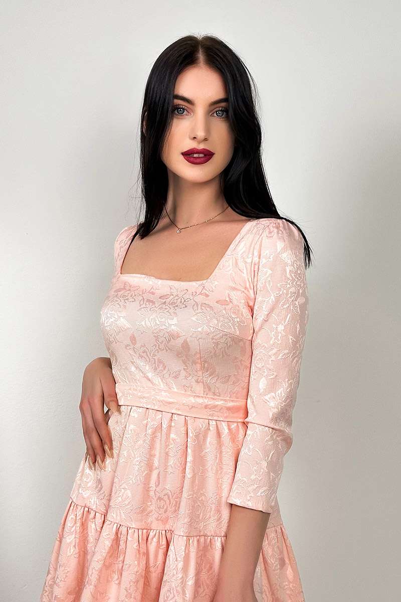 Персикова Сукня Жаккард 3D Весна 24018 представлена в розмірах від S до XL, що ідеально підходять для весняного гардеробу.