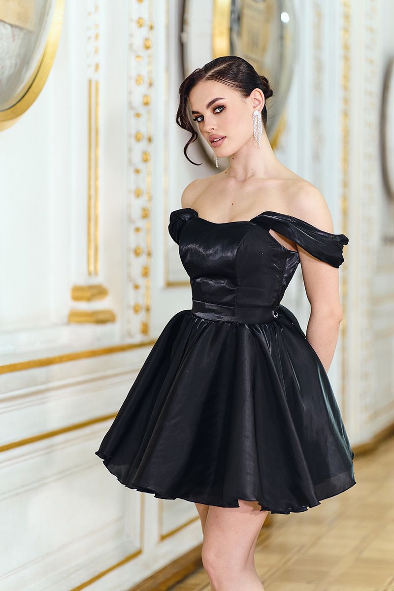 Модель виконана з органзи з делікатним шовковистим блиском, яка красиво переливається при світлі та надає образу глибини. Чорний колір підсилює цей ефект, роблячи сукню універсальною та завжди доречною.