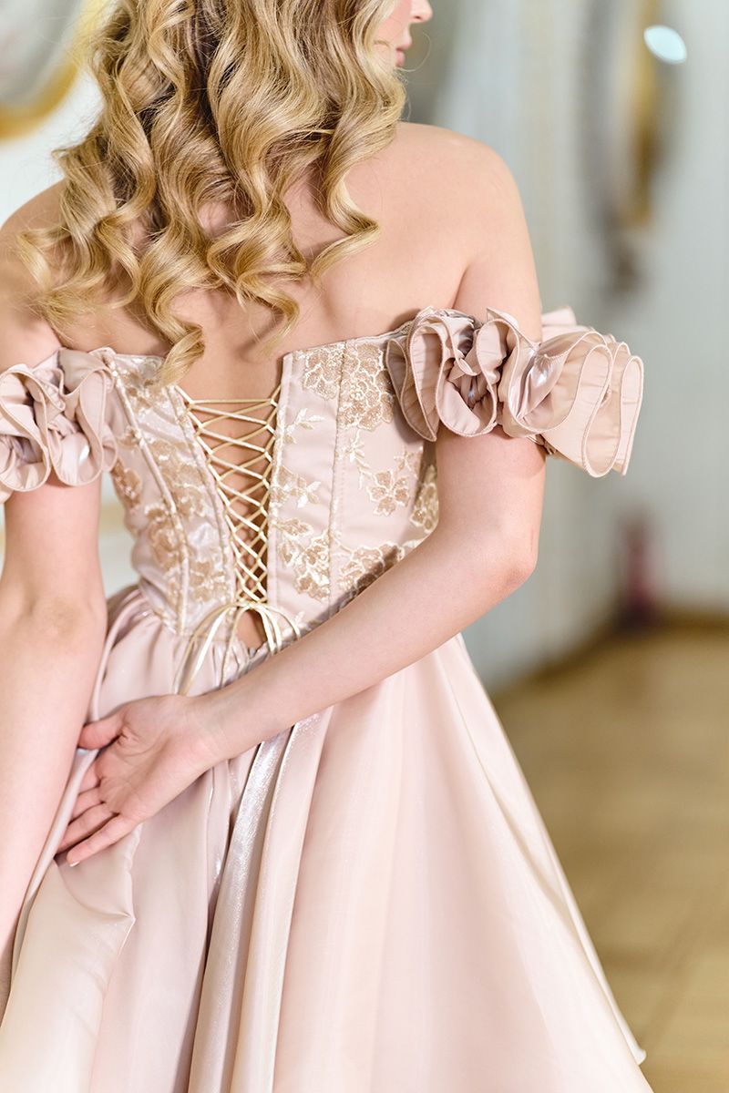 Відкриті плечі та об’ємні декоративні елементи на руках додають образу романтики та легкого кокетства, роблячи цю модель ідеальною для святкових подій.