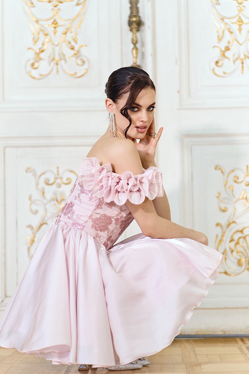Відкриті плечі та об’ємні декоративні елементи на руках додають образу легкого романтизму та роблять силует більш виразним і запам’ятовуваним.