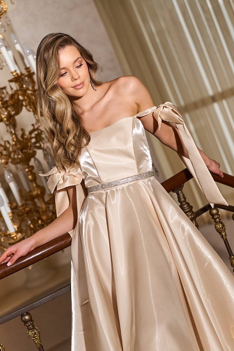 Кремова корсетна сукня з бантами на плечах 26004 — це поєднання ніжності, елегантності та делікатного сяйва. Світлий кремовий відтінок виглядає благородно та м’яко, створюючи образ, який асоціюється з витонченістю, чистотою та бездоганним смаком.