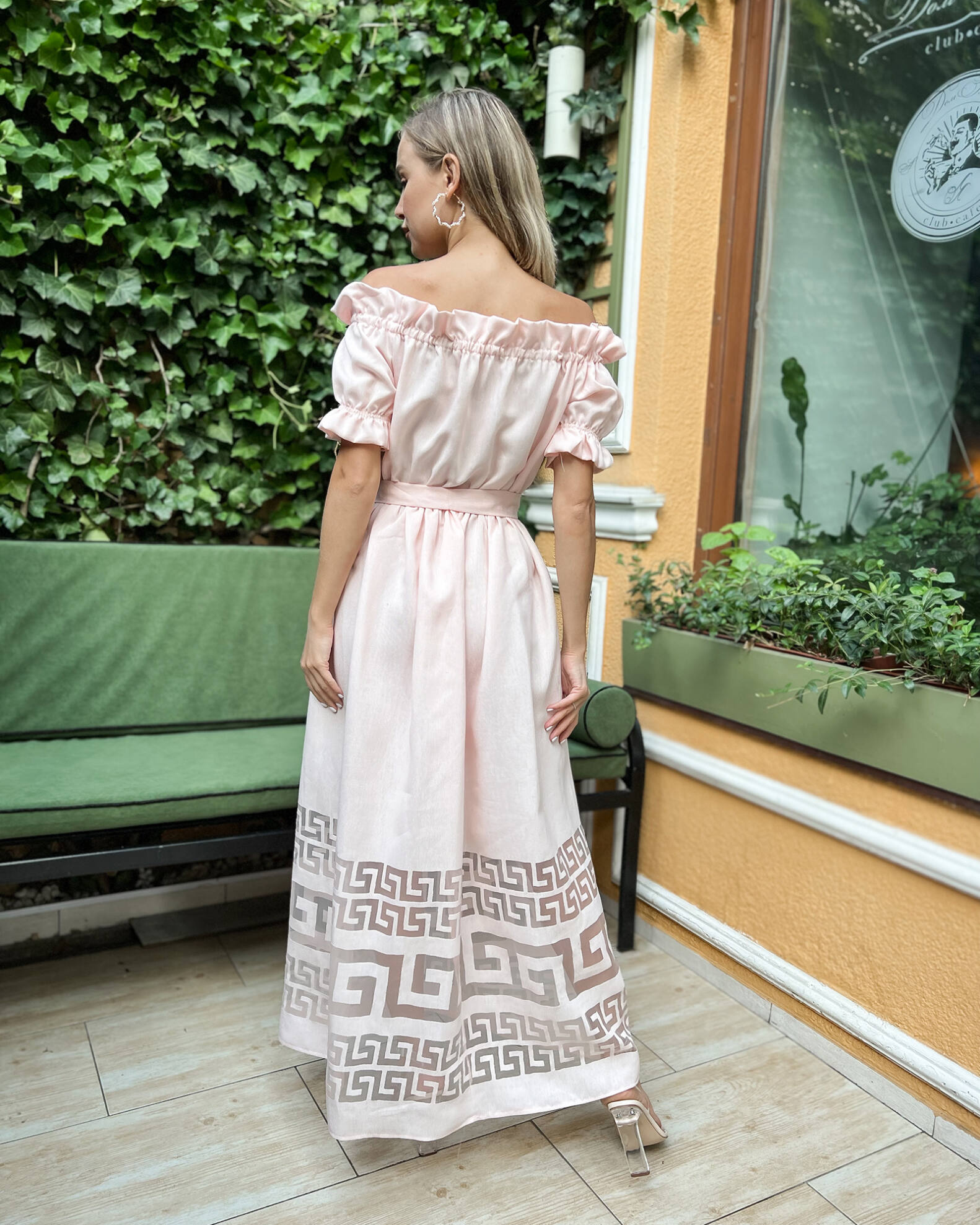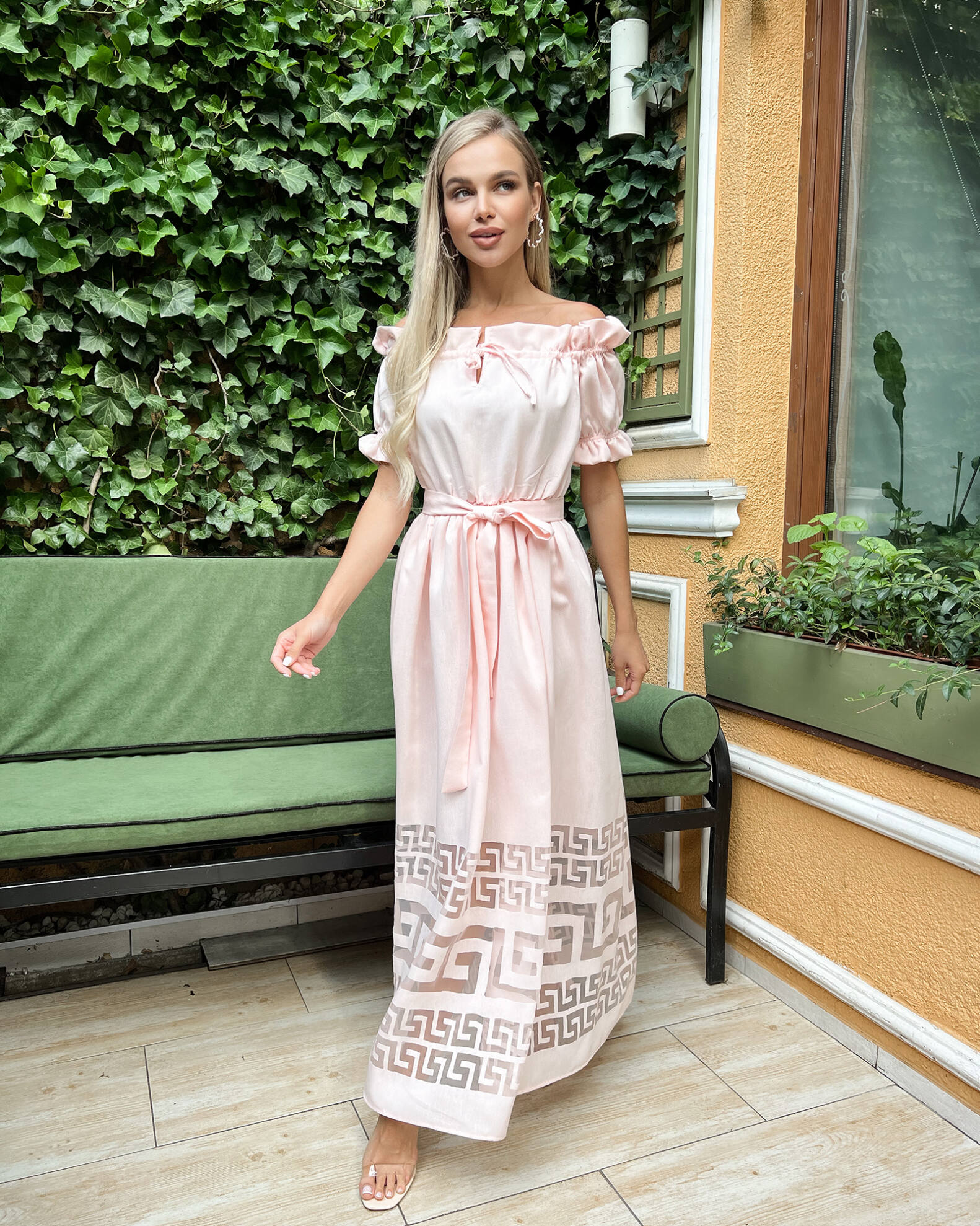 Талію підкреслює ніжний пояс у тон сукні.