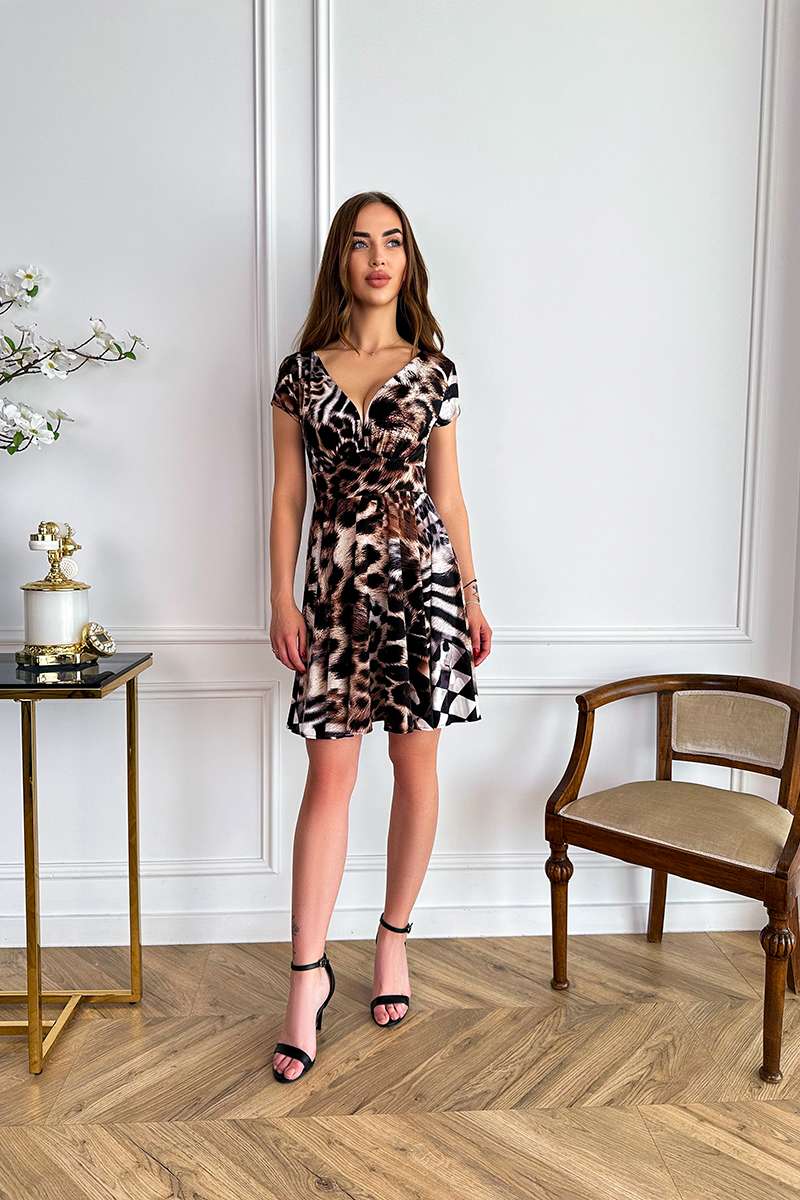 Шоколадна Молодіжна сукня – це стильний вибір для літніх прогулянок та вечірок. Виконана з трикотажної тканини “масло” з анімалістичним принтом, сукня додає елегантності та вишуканості будь-якому образу. Потайна змейка по спинці та шнуровка з пуговицею-застежкою забезпечують зручність у носінні та регулюванні.