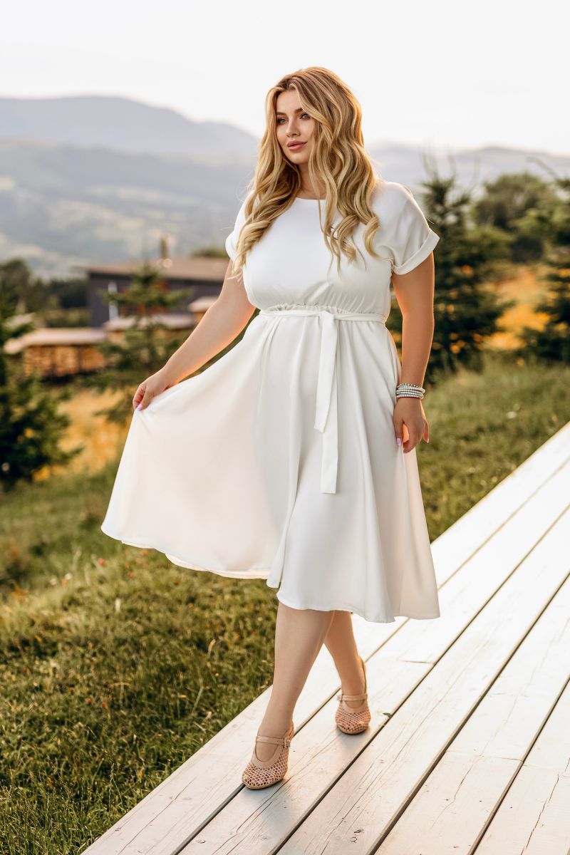 Переваги сукні: вона не лише підкреслює талію, але й маскує зони, які хочеться приховати, завдяки вільному кльошу. Пояс додає силуету стрункості, а застібка-пуговка на спині забезпечує легкість одягання. Ви отримаєте універсальну модель для повсякденного життя, яка однаково гарно виглядає і з кедами, і з підборами. Молочна Повсякденна Сукня Шовк Міді 25059 — це ваша інвестиція в комфорт, красу і впевненість.
