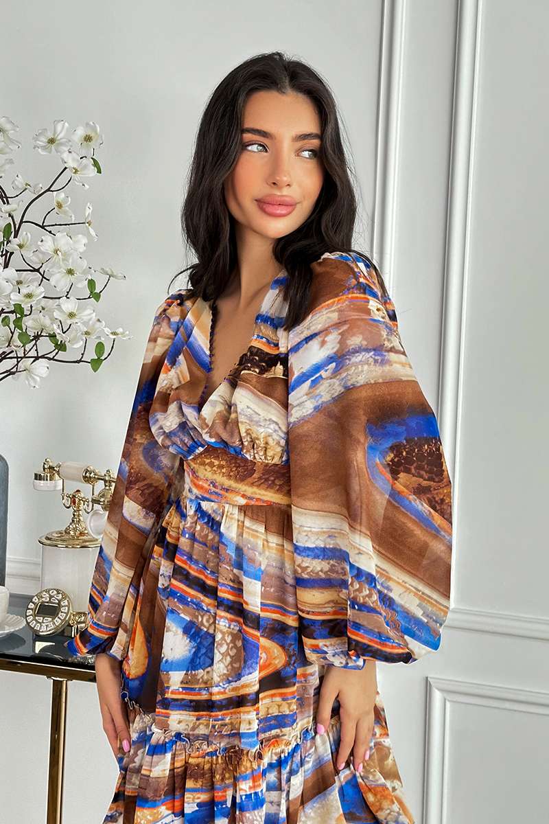 Відкрийте для себе цю Романтична Шифонова Сукня Принт 24027 Бежева, яка стане чудовим доповненням до вашого гардеробу. Виготовлена з делікатного шифону з підкладкою з трикотажу, ця сукня дарує вам не тільки стильний вигляд, а й комфорт при носінні. Легка тканина створює відчуття повітряності та додає вашому образу ніжності.