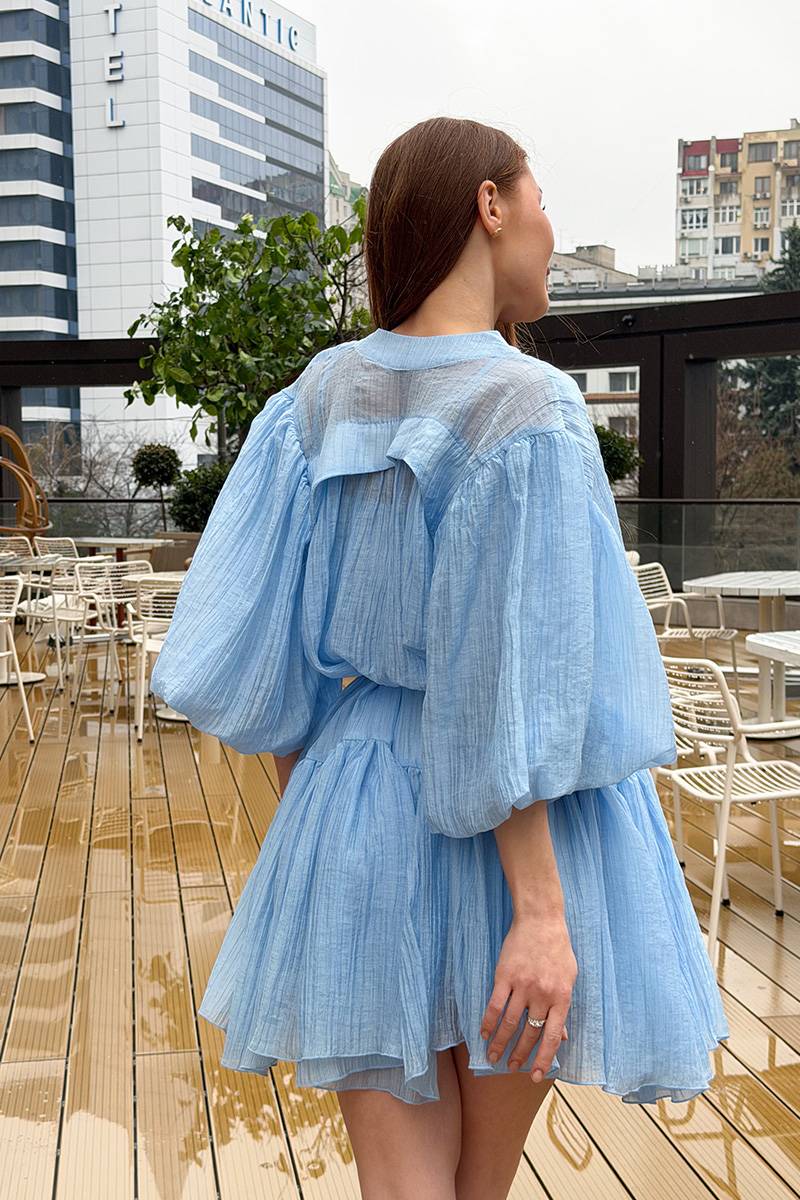 Питання та відповіді про Блакитна Сукня комбінація з повітряним верхом 26021