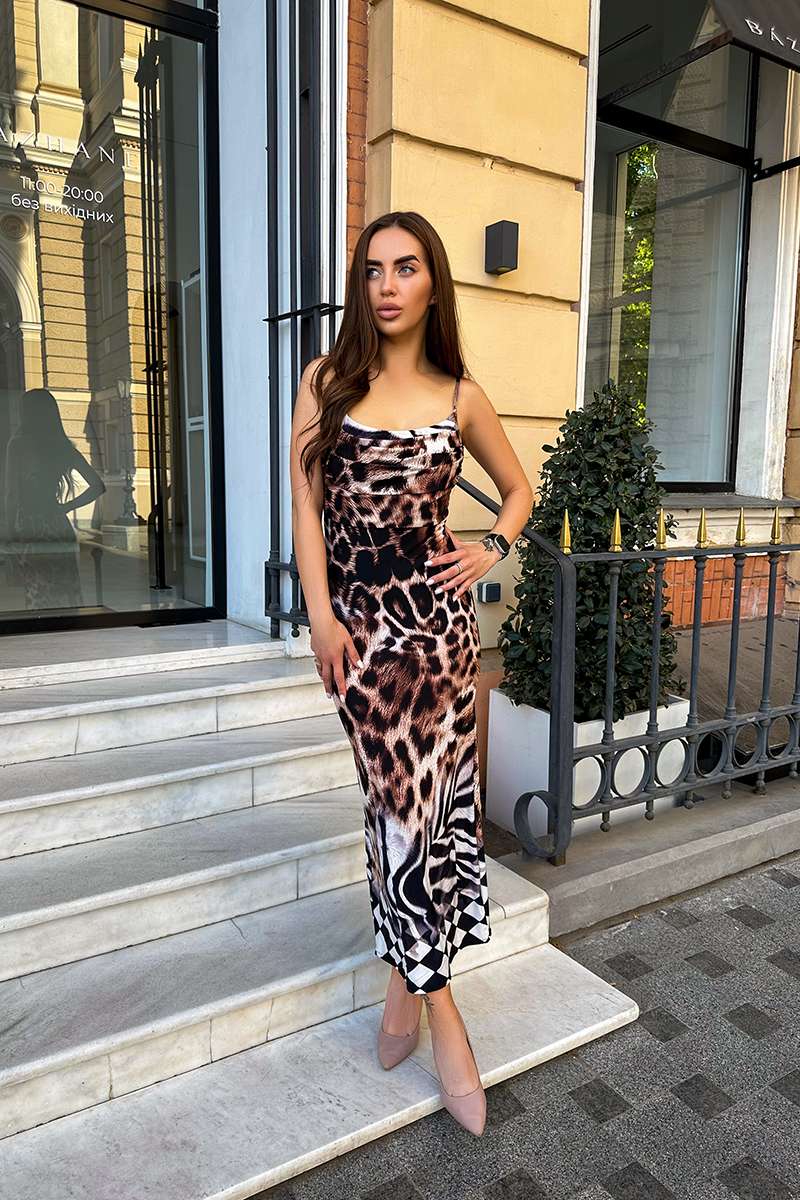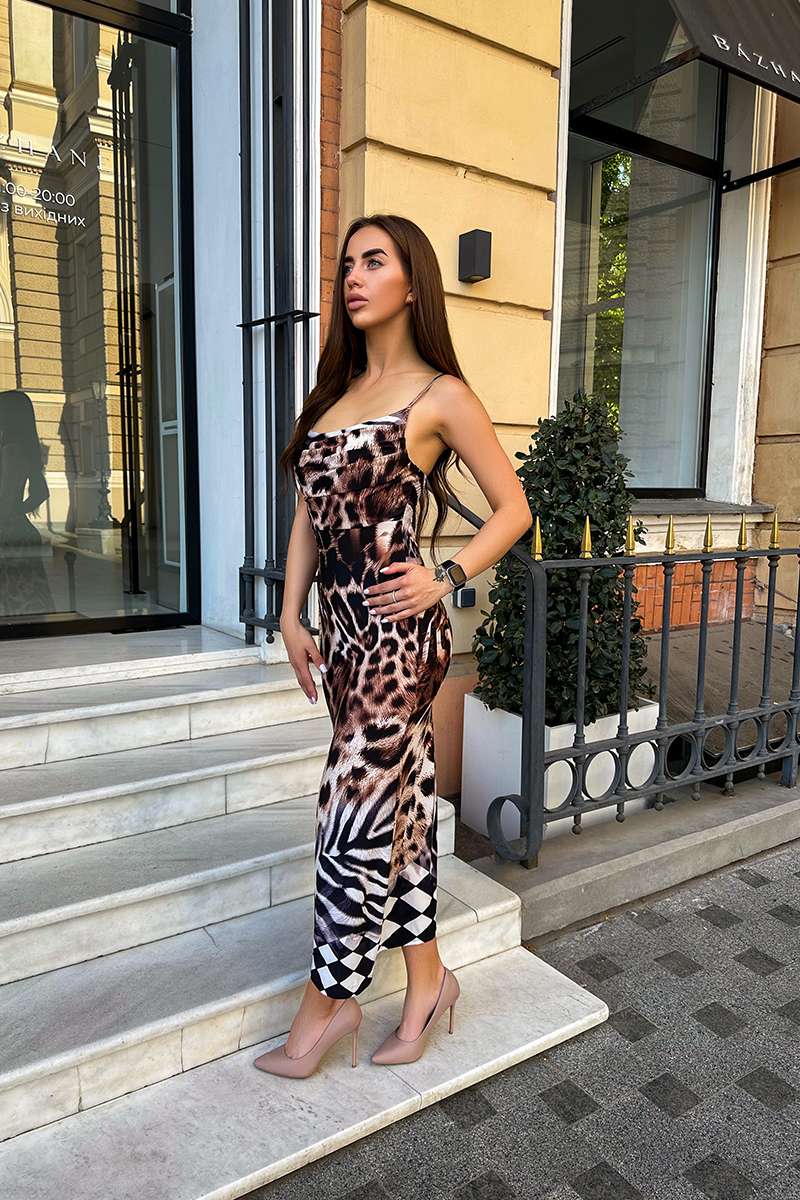Шоколадна Трендова Сукня – це ідеальний вибір для стильних та сміливих жінок. Виконана з трикотажної тканини з анімалістичним принтом, ця сукня підкреслює фігуру та додає образу динамічності та шарму. Облягаючий крій міді-довжини робить її універсальною для різних подій, від повсякденних прогулянок до вечірок. Сукня ідеально сидить на тілі, забезпечуючи комфорт протягом усього дня.