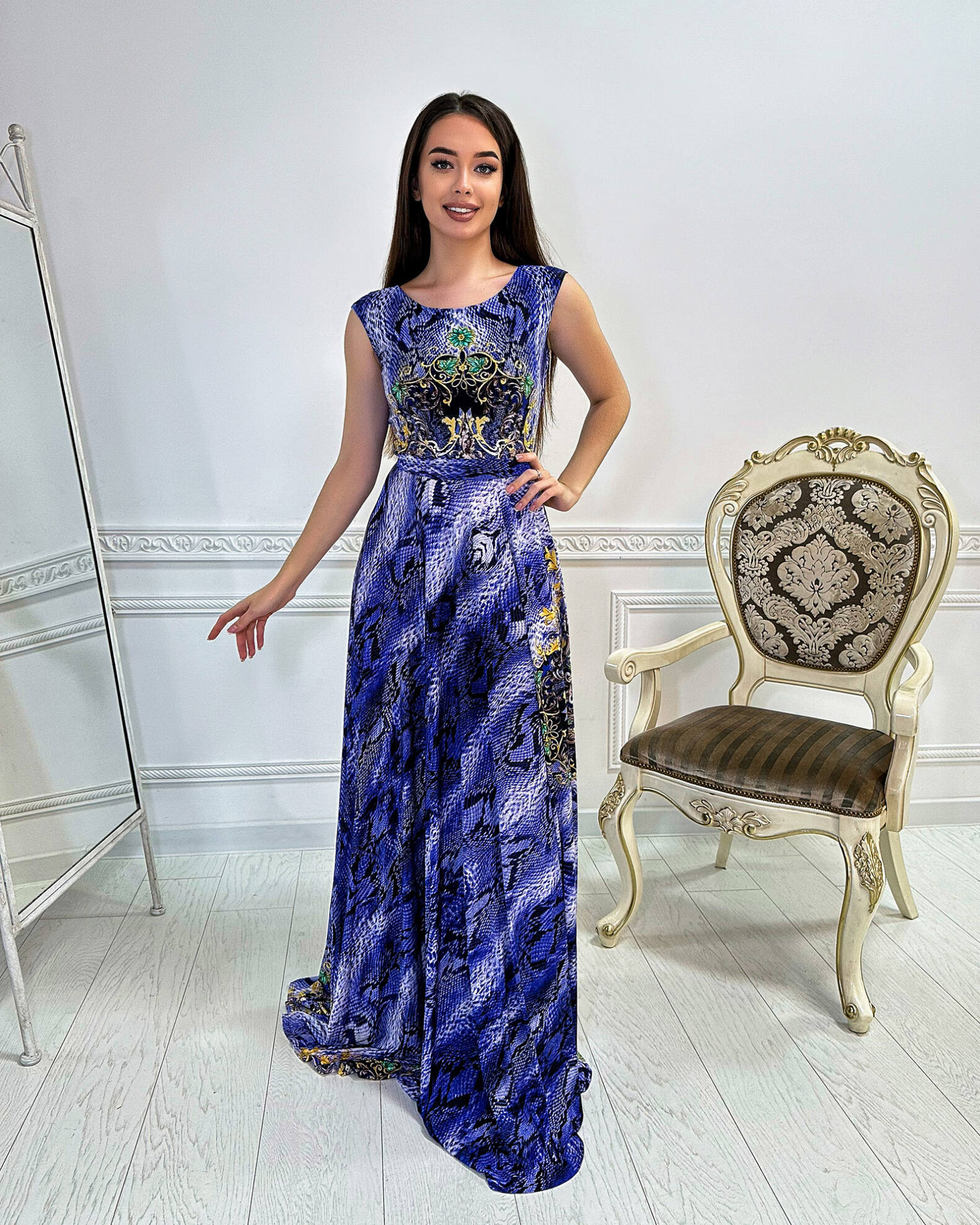 Ця вечірня сукня виконана з тканини “кристалл”, яка надає виробу елегантного блиску і легкості. Особливістю сукні є потайна молнія на лицьовій стороні та пояс, який входить в комплект. Насичений принт в кольорі додає сукні оригінальності та стильного вигляду. Це ідеальний вибір для особливих подій, коли ви хочете виглядати неповторно.
