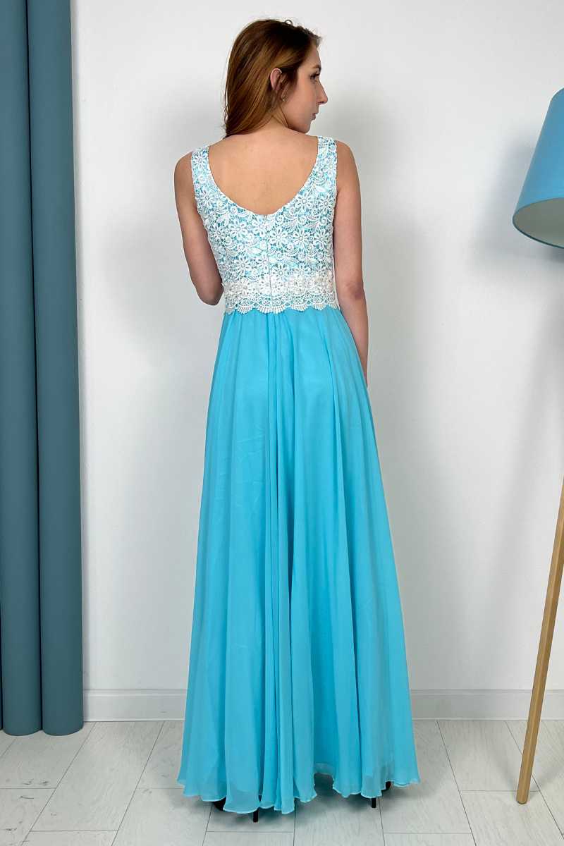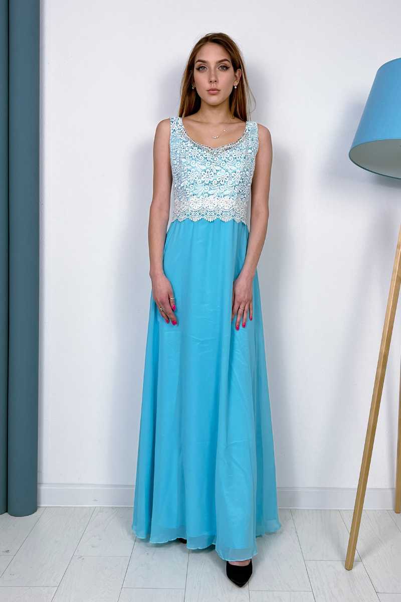 Від талії сукня струмує легкими хвилями до підлоги.